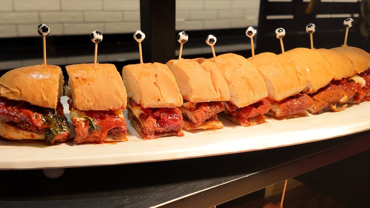 The Chicken Cutlet Sandwich is a 1½-foot bun loaded with thin breaded and fried chicken cutlets, a tomato vodka sauce, burrata cheese, fresh basil, and a sweet but slightly spicy cherry pepper relish that makes it better than your everyday chicken parm. It’s great if you can get it, but the sandwich is available only in stadium suites.
