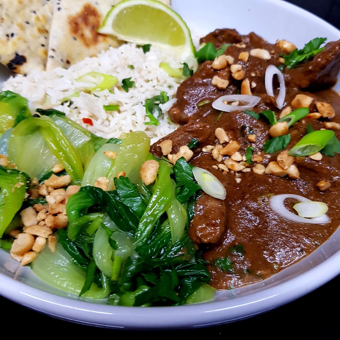 From Scratch Pork Massaman Curry, Coconut and Lime Rice, Saucy Pak Choi with Peanuts and Quick Flat Bread. Finished with Fresh Coriander and Toasted Peanuts.