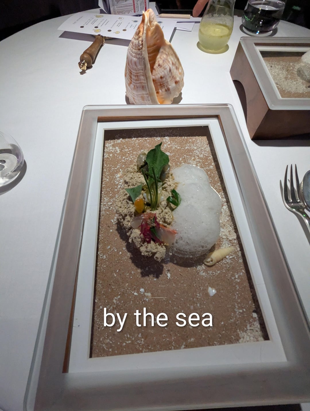 My favorite non traditional dish of the night. There are little pieces of fish and razor clams in the sand, the sand is a salty crispy umami flavorful mess and it works so well while being extremely weird. You put on headphones and listen to sounds of the beach while you eat and it's fantastic.