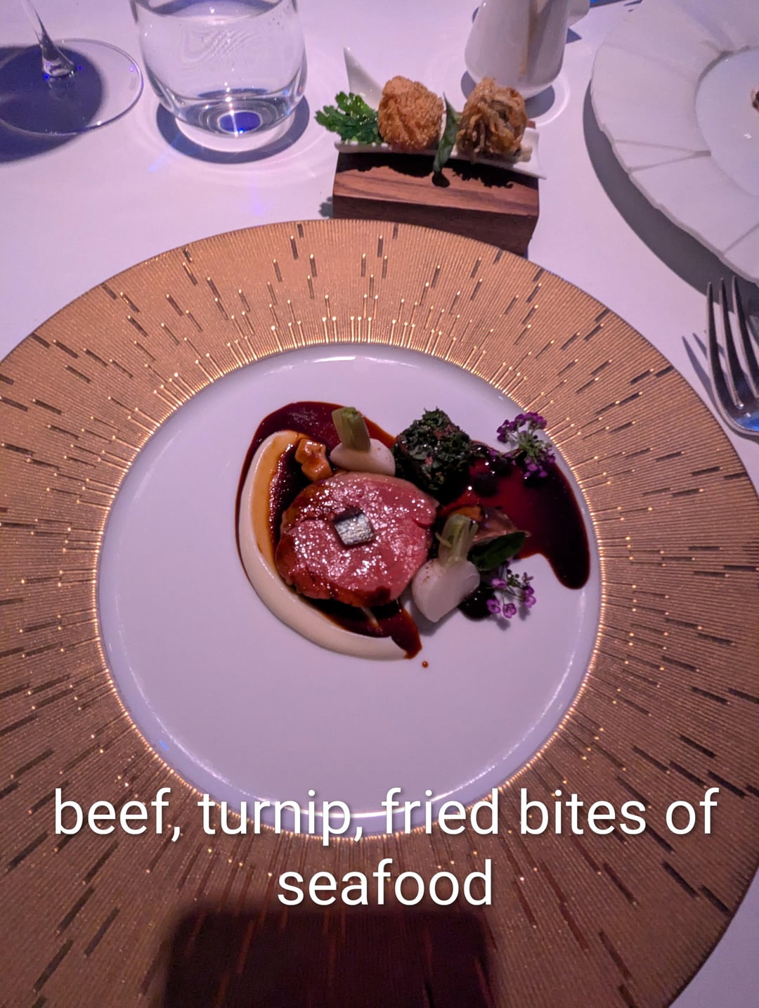 Additionally a discovery and playful pairing. The discovery(200 pounds) was underwhelming, would go for the curiosity (~400pounds) or just a few drinks/glasses of wine next time. The wines weren't bad but they weren't exactly good either. Some paired well, some did ok, it just didn't enhance the experience. The playful pairing was very well done, the red blend with the meats was fantastic and complimented the beef so well. Despite the discovery pairing being mediocre the somm was wonderful and very educational throughout.