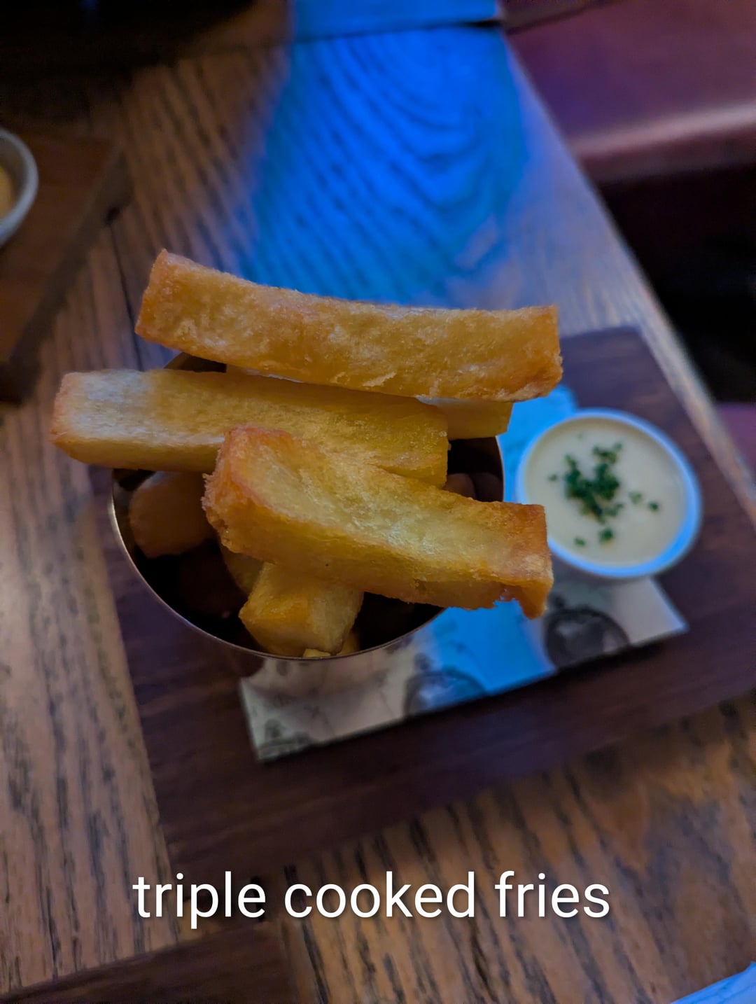 Ubiquitous now, but trying the original triple cooked fries was amazing. So crispy and yet soft and airy. If they served this at the fat duck I wouldn't have complained at all. The scotch egg and sausage were good too, nothing mind blowing like the fries but good. If we had more time would go back to a dinner or lunch there.
