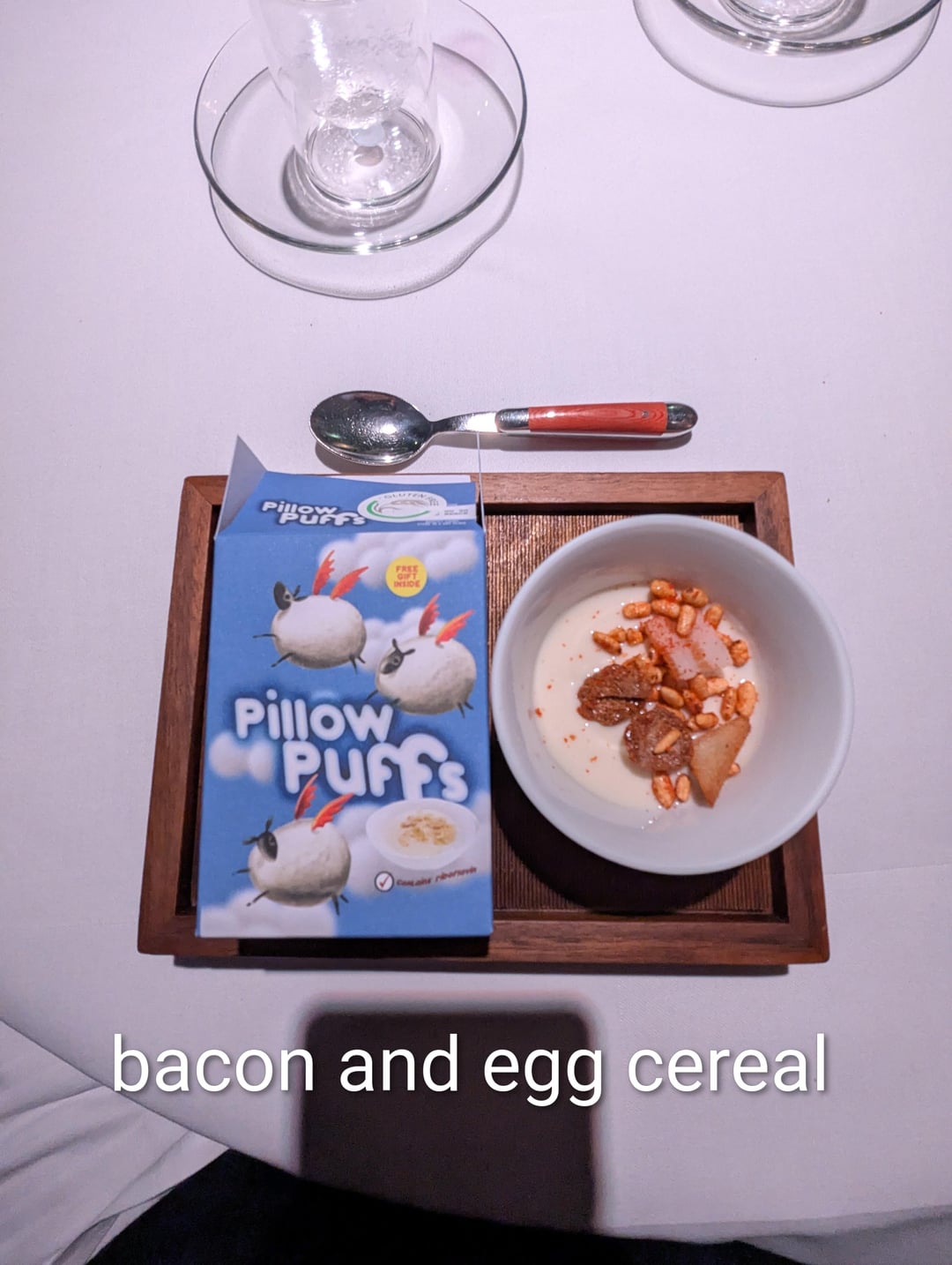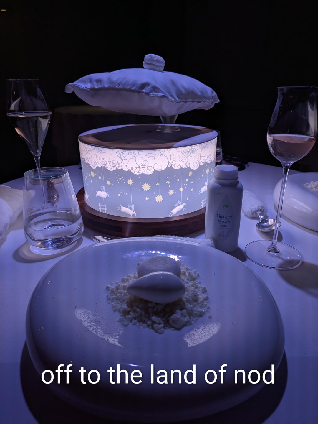 Always good to see an update of what is going on at The Fat Duck. ‘Off to the Land of Nod’ was one of my highlights from eating from The Journey menu last year (where it is called ‘Counting Sheep’), but I can see exactly why it didn’t work as much for you: on The Journey menu, they have two of the white discs, and though they look identical, they are of very different textures and consistencies. Here, you seem to only have one, and so the whole purpose of surprise and contrast is defeated. I’m not sure this was a good decision – why not just get rid of the ice cream, if the aim is to reduce the amount of food.