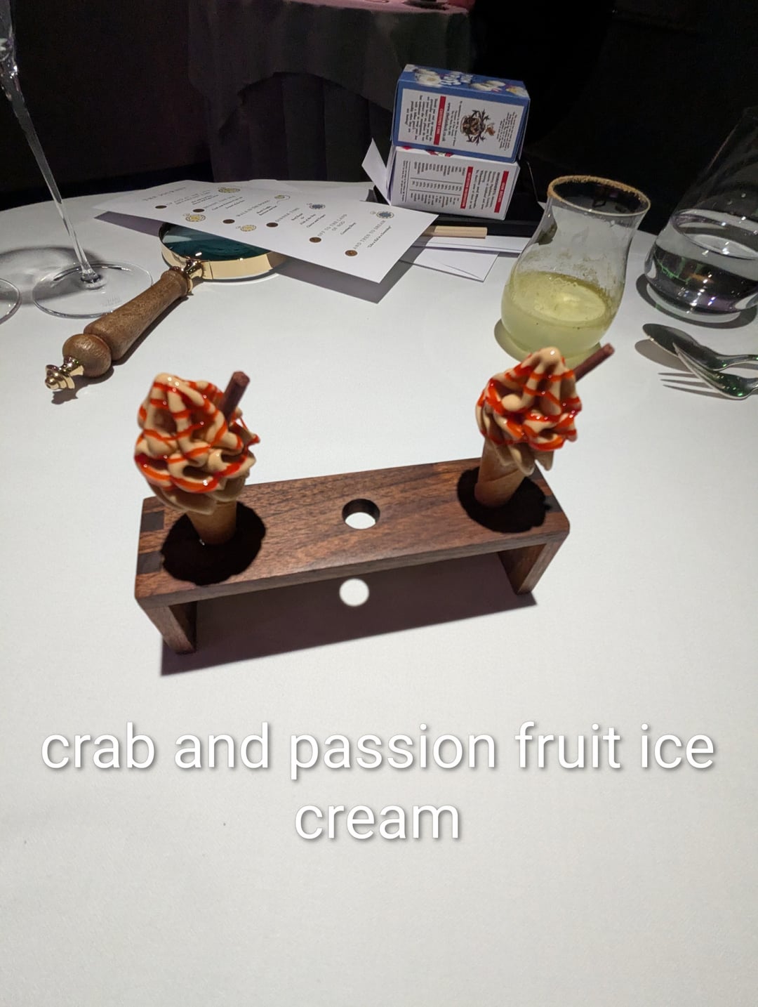 A fun and very weird combination that works surprisingly well. Passion fruit flavors in the red sauce, a cold crab mousse in a crispy cone. I wouldn't eat this out of a tub. But for one bite it was very good.