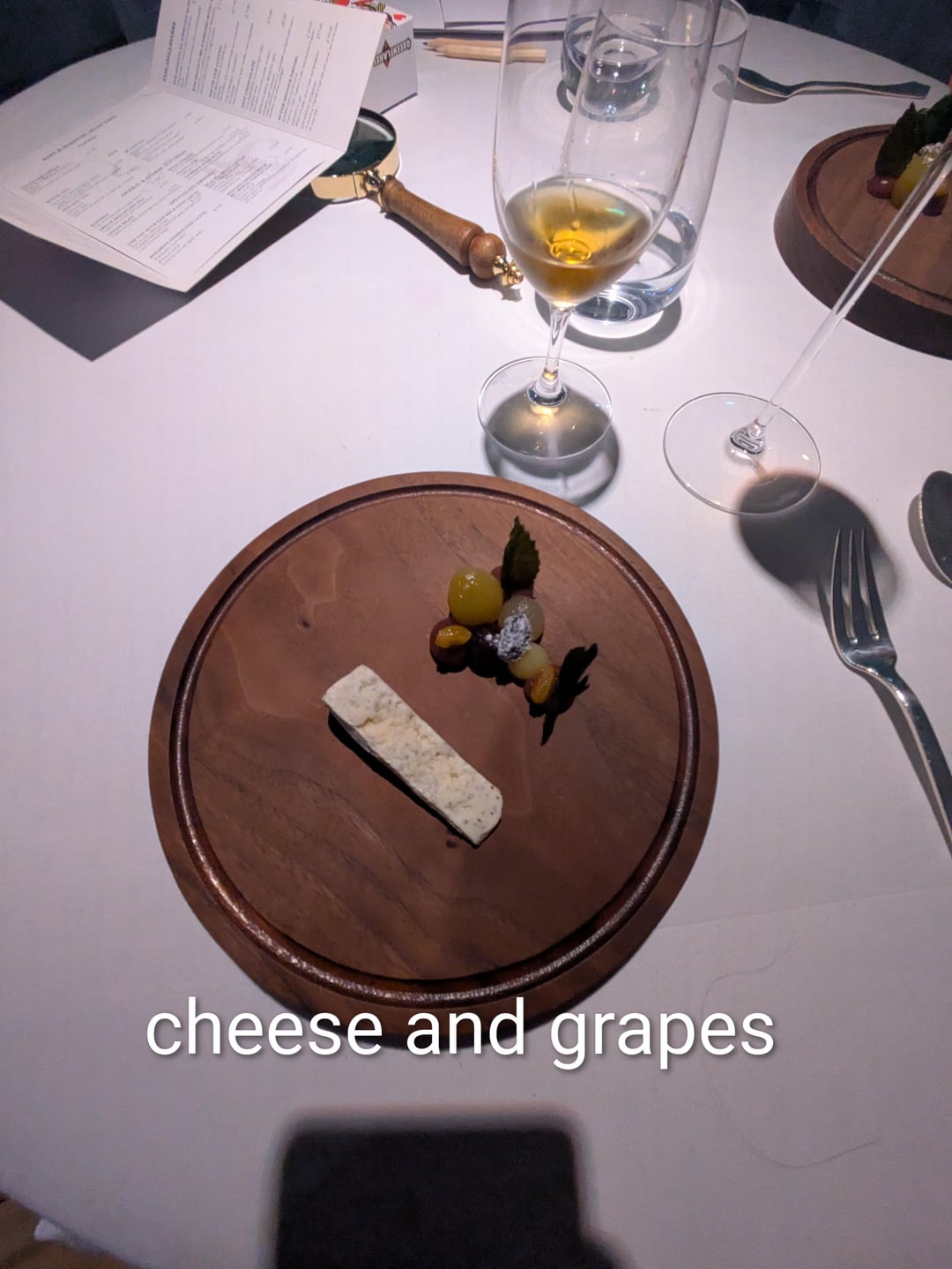 As is the way here, neither were actually cheese or grapes. Cheese was a cheesecakesque ice cream with truffles and a shortbread like crust. The grapes were all different jells of different fruits. Waitress dropped it off with a sly it's just cheese and grapes and let us explore on our own.