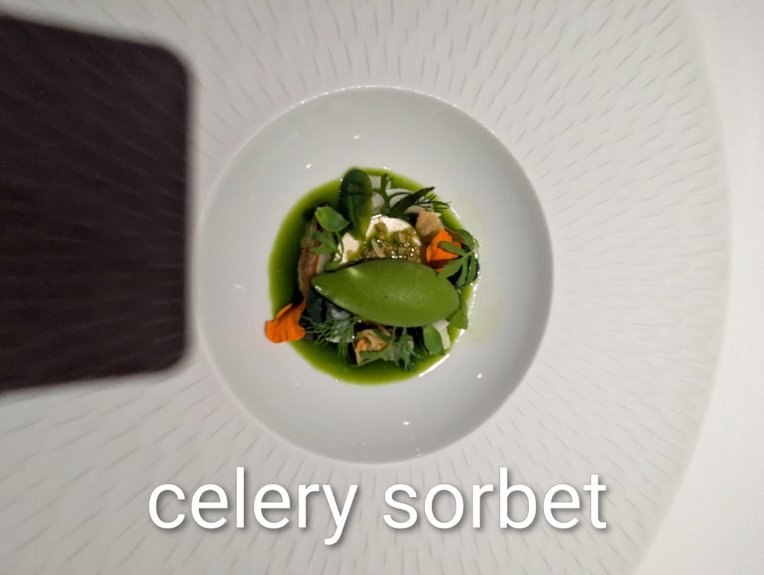 An herby green broth of 'green herbs and green apples" works really well with the celery flavored sorbet and cheese. The cheese was so smoky and cut through the herbs extremely well. Would be perfect on a hot day.