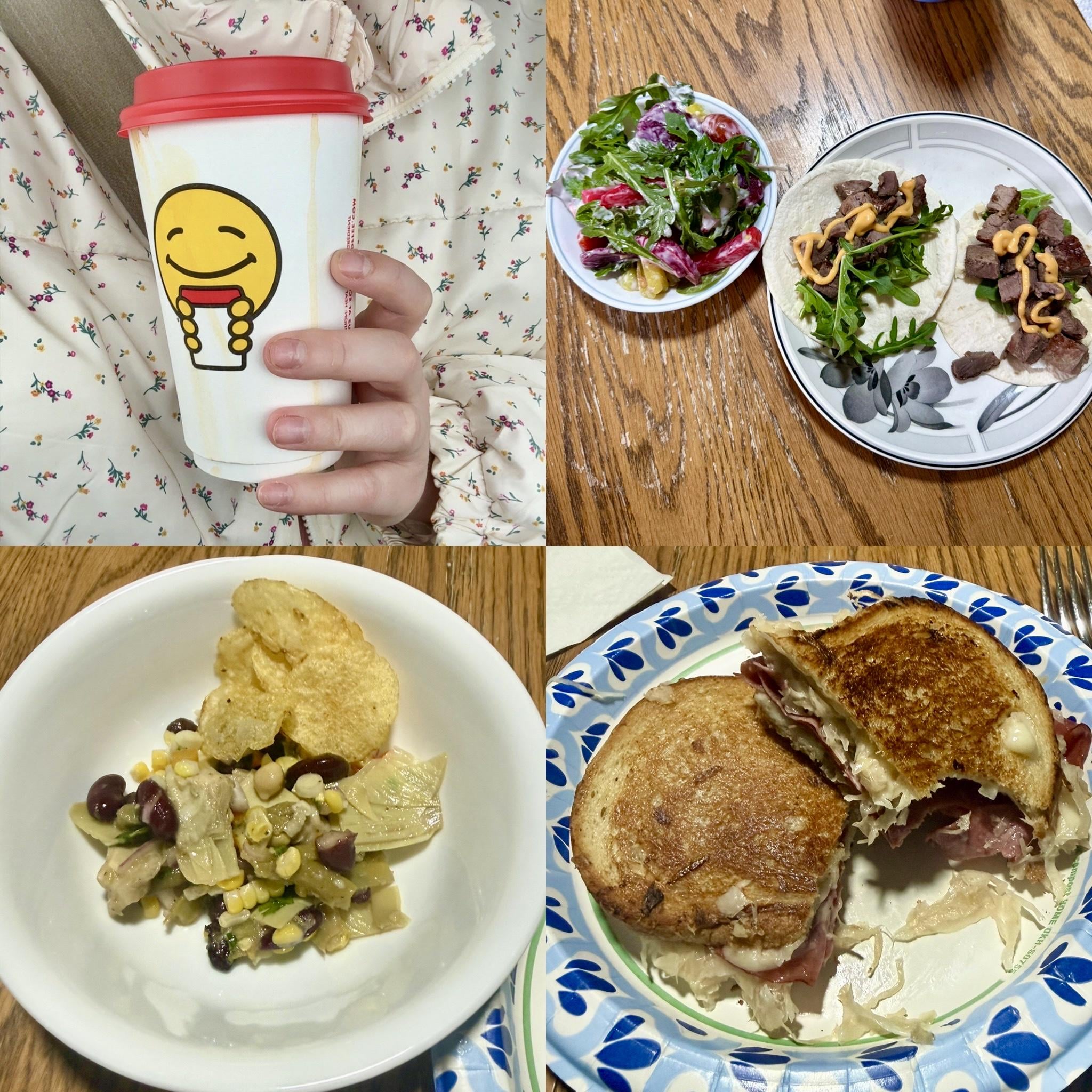 Saturday 😊by Flybirdieee 1 Comment Flybirdieee 2 days ago 7:00 AM: 110 – Sugar free vanilla almond milk latte12:00 PM: 350 – Costco grass fed steak (120) – 2 mini zero carb tortillas (75) – Aged cheddar laughing cow wedge (25) – Arugula (~0) – Spicy Mayo (30)– Side Salad – Romaine and arugula, radish, pepperoncini, pickled turnip, beets, tomatoes, 30g Bolthouse Farms blue cheese dressing – (100)7:00 PM: ~850? – Rueben sandwich made by my aunt – A small scoop of bean salad and a few chips