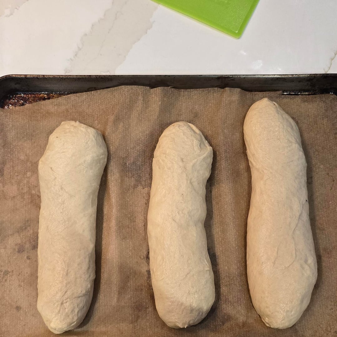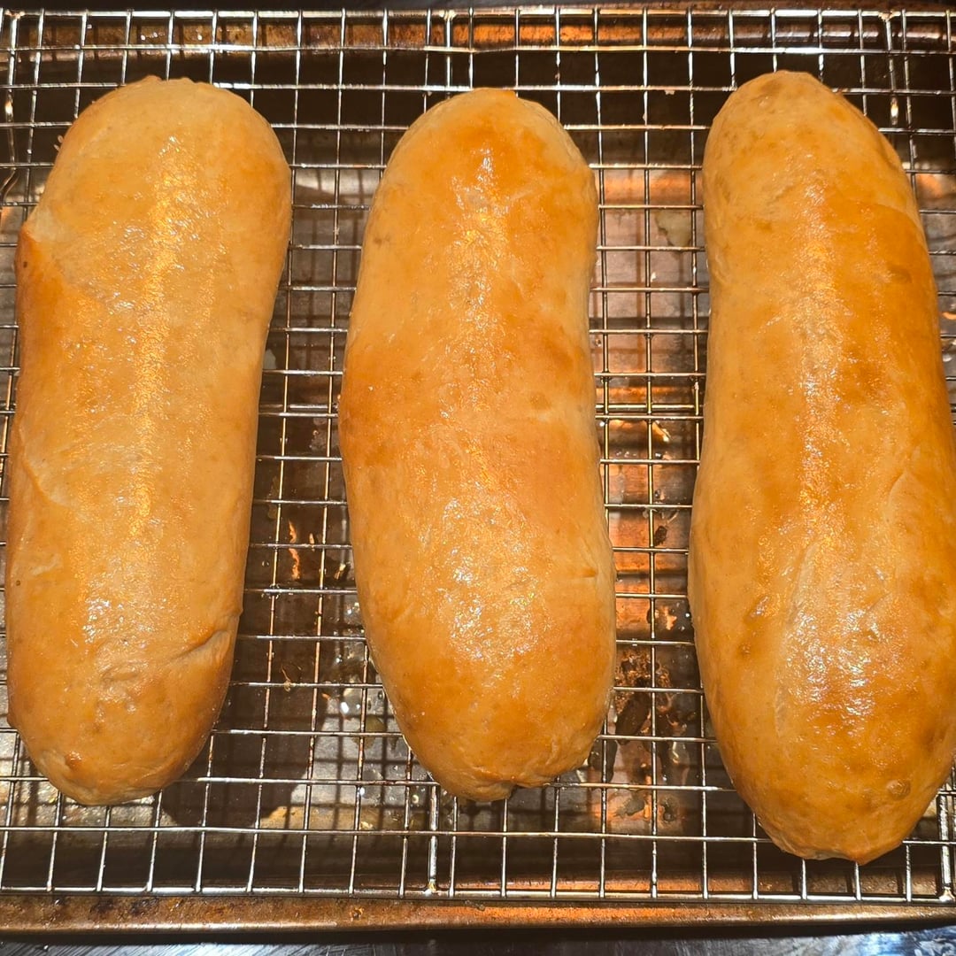 • ​Bake: Prove and bake the hoagies. Split, brush with garlic-herb butter, and toast the crumb.