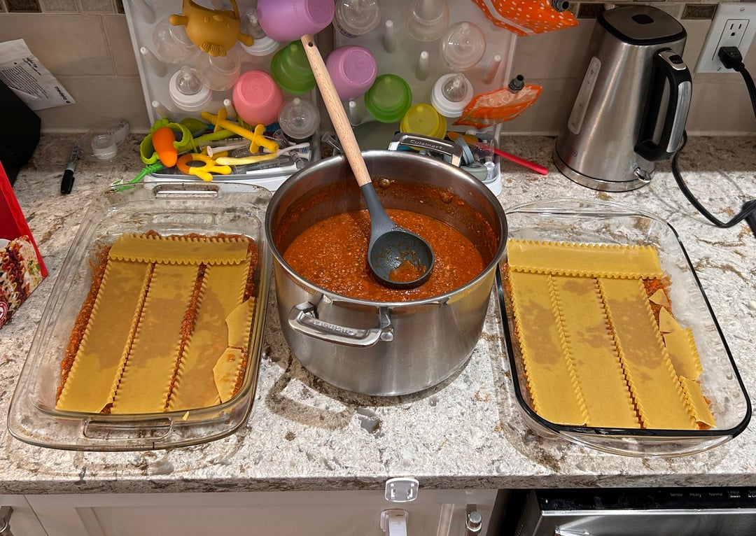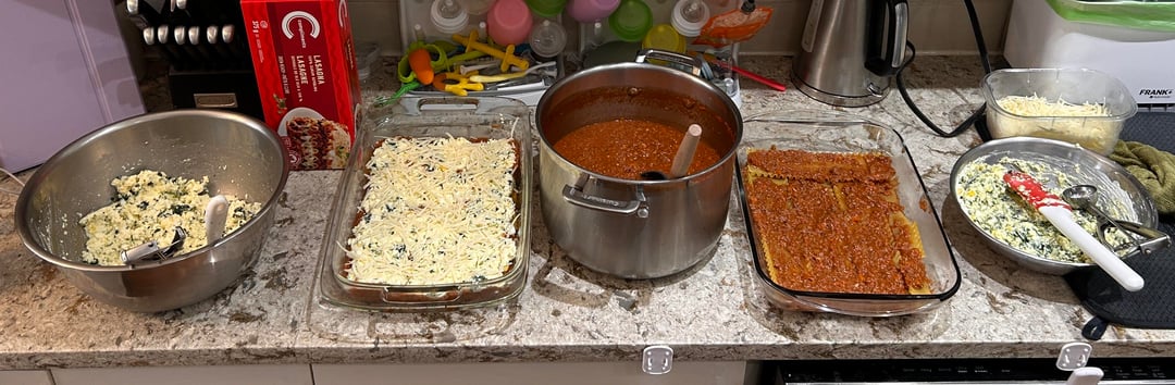 too_granola_for_you 1 day ago LASAGNA (MAKES 2 – 9×13 PANs)A flexible lasagna that makes two full trays. Freeze one for later or feed a crowd.INGREDIENTSOlive oil2 tbsp minced garlic3 cups chopped mirepoix (celery, onion, carrot)2 lbs ground meat of choice (we used lean ground beef)2 jars pasta sauce2 tbsp tomato paste1/4 cup Worcestershire sauce1/2 tsp salt1/4 tsp pepper12 hard boiled eggs, mashed3–4 cups soft cheese of choice (ricotta or soft goat cheese)Frozen chopped spinach, thawed and excess water squeezed out2 cups hard cheese of choice, grated (we used Romano)3–4 cups mozzarella of choice (we used regular for one, and goat mozzarella for the other), shredded2 packs of oven ready lasagna noodles