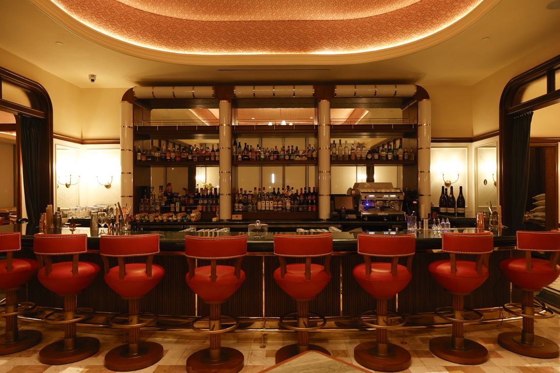 A mural by artist Jessalyn Brooks, known for her sculptural interpretations of the female form, adds an artistic focal point to the dining room. Throughout the space, plush pastel upholstery in shades of pink, green, and yellow is paired with glossy wood paneling and rich marble tables, creating a warm yet glamorous ambiance. At the center of the restaurant, a grand bar provides the perfect gathering place for cocktails, conversation, and the lively social energy that has long defined the Signor Sassi brand.