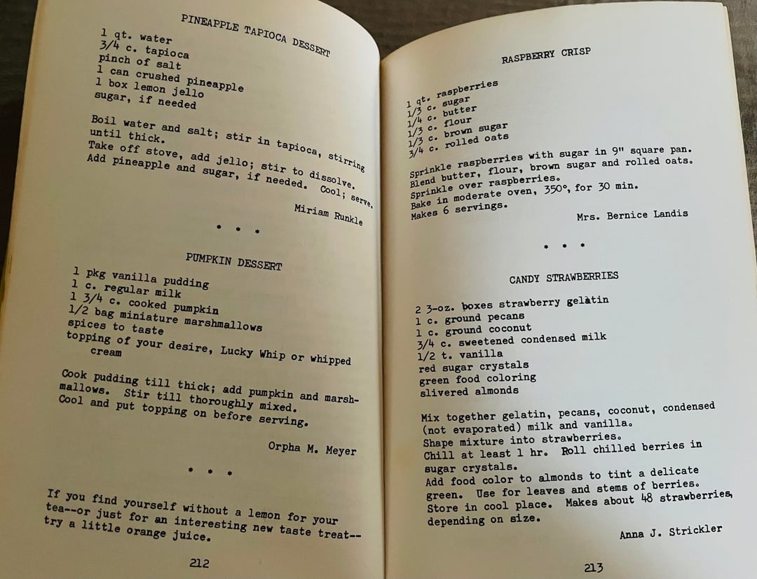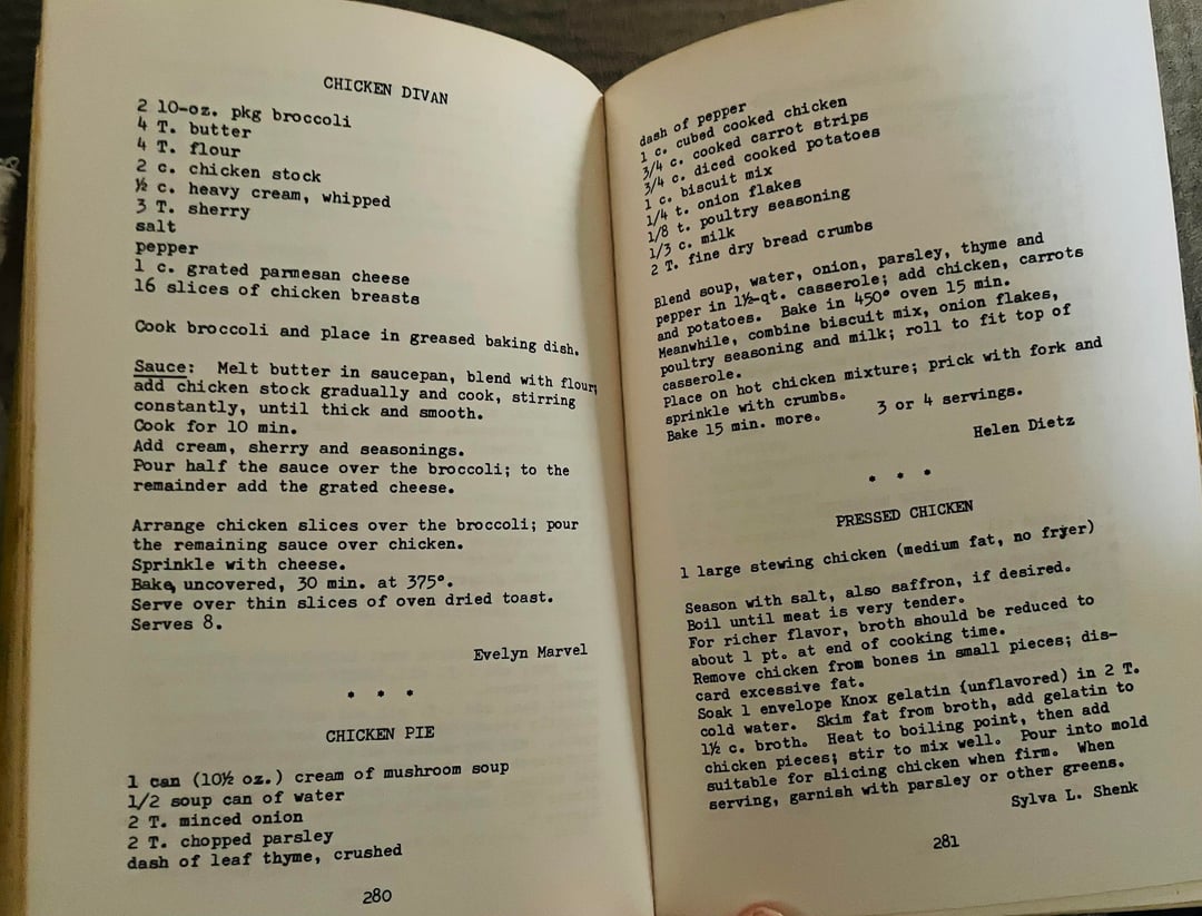 Just some more recipes from this church book by vintageideals 3 Comments touslesmatins 2 weeks ago That strawberry dessert looks like my kind of dessert. A lot of these recipes are intriguing. anislandinmyheart 2 weeks ago I love these kinds of cookbooks! So cosy lamalamapusspuss 2 weeks ago I’m trying to imagine how the Mock Duck would taste anything like duck. I guess the poultry seasoning does the trick.