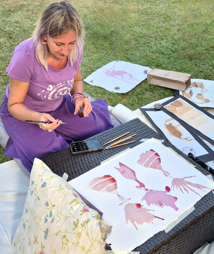 “I use a medium that is quite expensive because it’s wine,” she noted, acknowledging its value, especially when transported far from Italy.