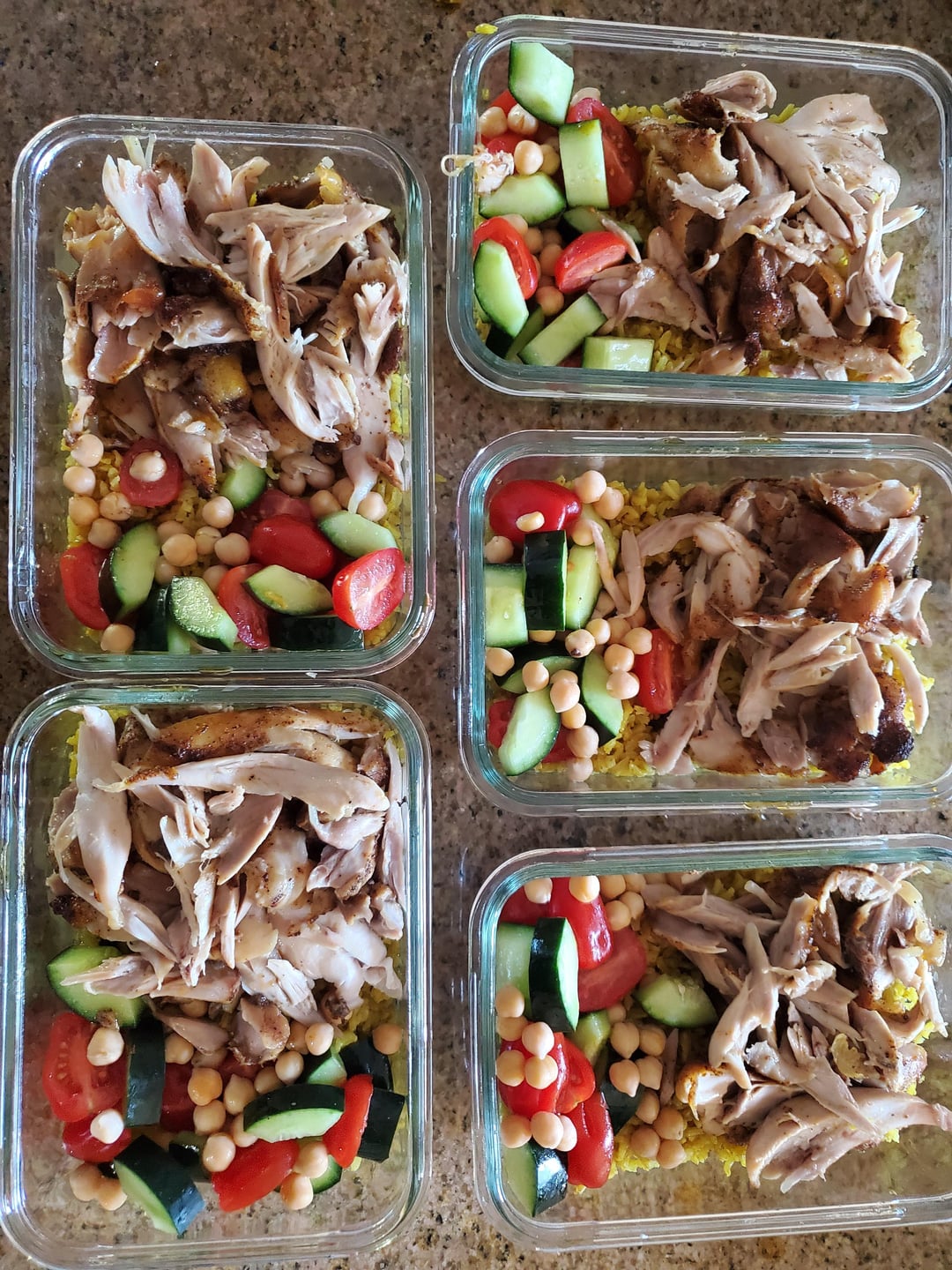 Ingredients: Brown basmati rice, grape tomatoes, cucumber (1 small), chickpeas (1/2 can), chicken drumsticks, Greek yogurt (1 cup), parsley