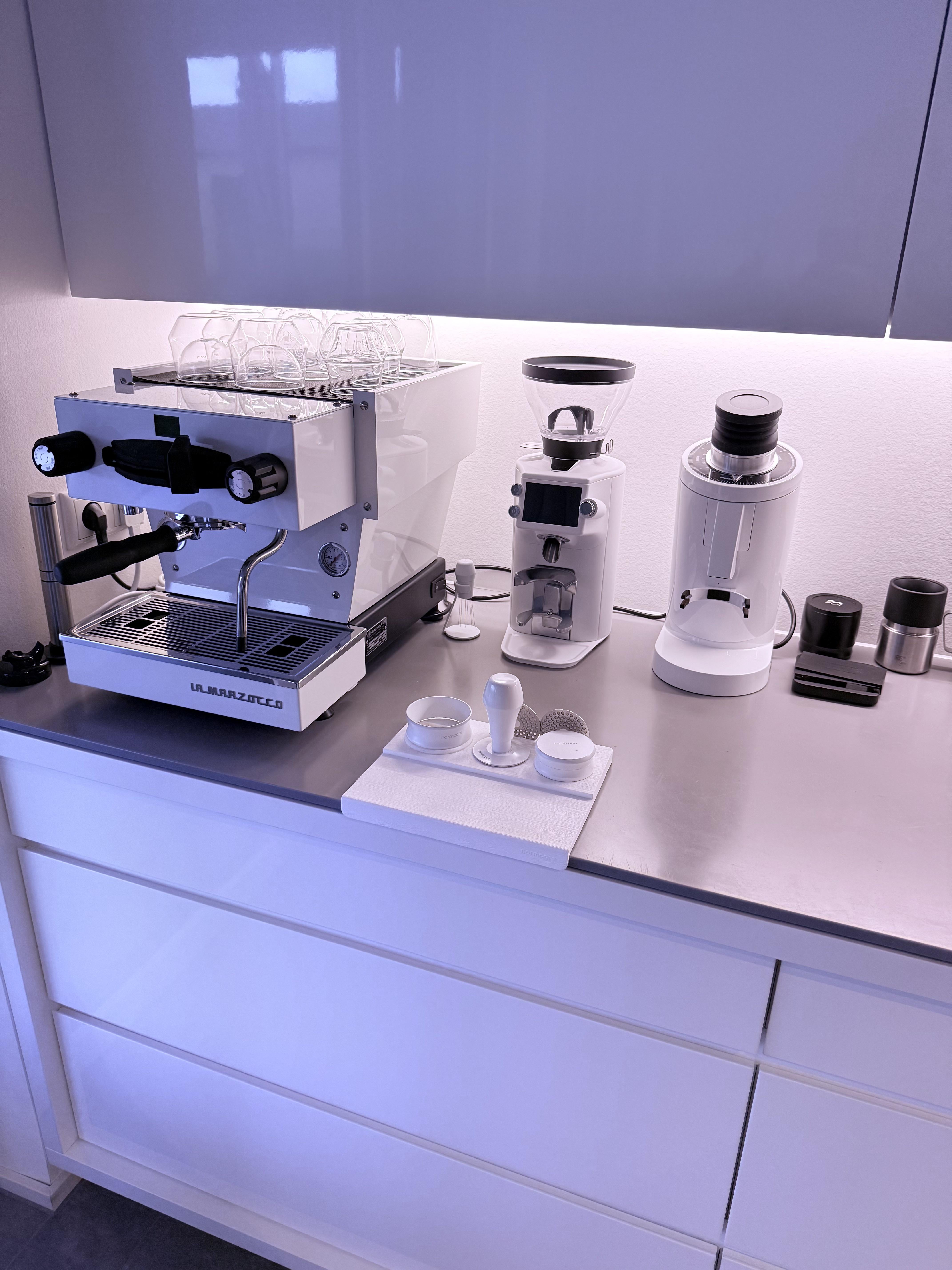 Rare to see an all white setup (in contrast to all black) and I am here for it. Looks dope and having both a GBW and single dose is by ultimate goal too. One for filter/lighter espresso and the GBW one for the daily espresso?