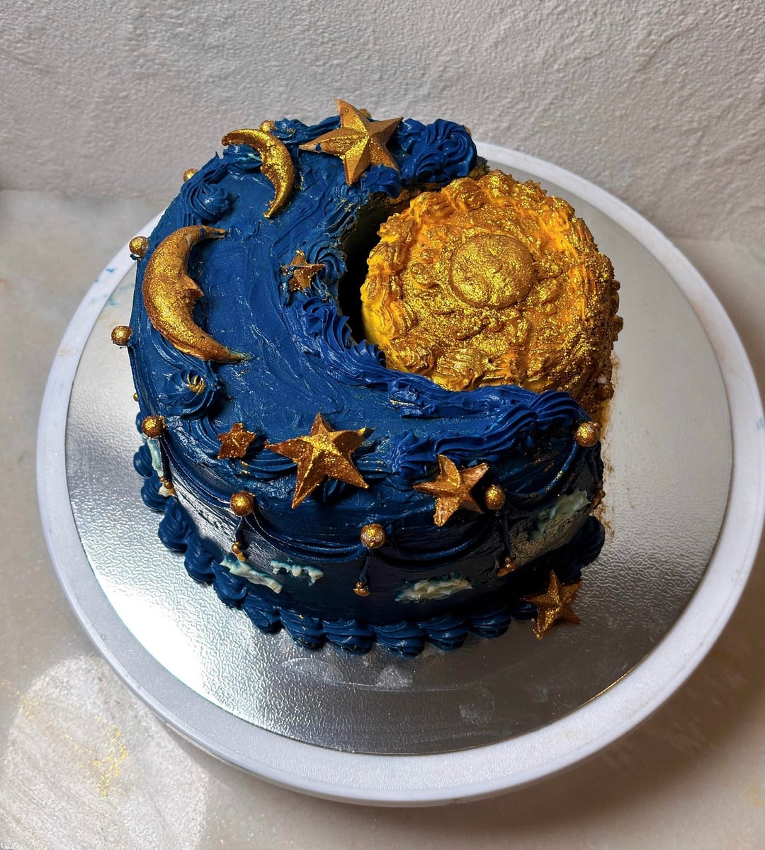 This cake is stunning the sun and moon theme looks incredible! For vegetarian stabilization you could try agar agar or vegetarian gelatin alternatives in whipped cream.