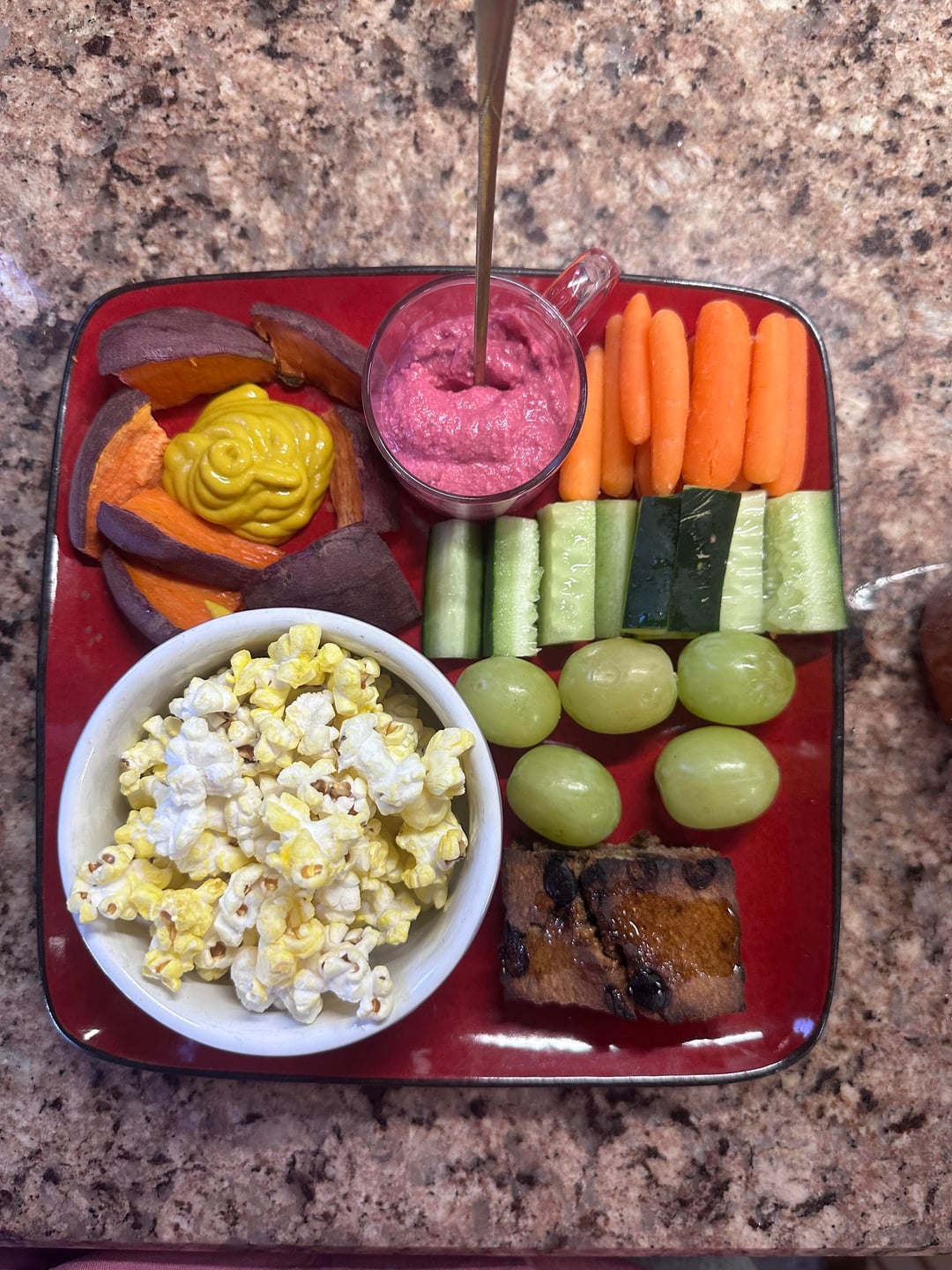 -lunch (451 cals): carrots, cucumbers, sweet potatoes, mustard, hummus, popcorn, grapes, & homemade banana bread w/ drizz of honey
