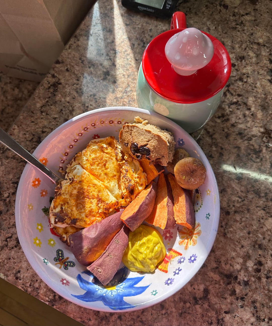 -breakfast (387 cals): eggs, sweet potatoes, mustard, figs, homemade banana bread, & matcha latte