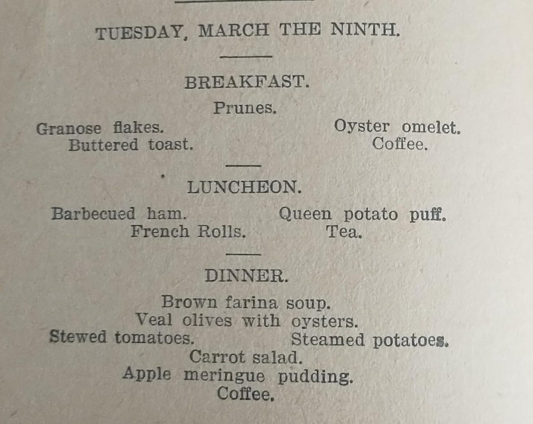 Oysters for breakfast and dinner. I wonder if they were canned and you needed to use them up. Reasonably balanced dinner. And compared to some, not so many different dished for the day