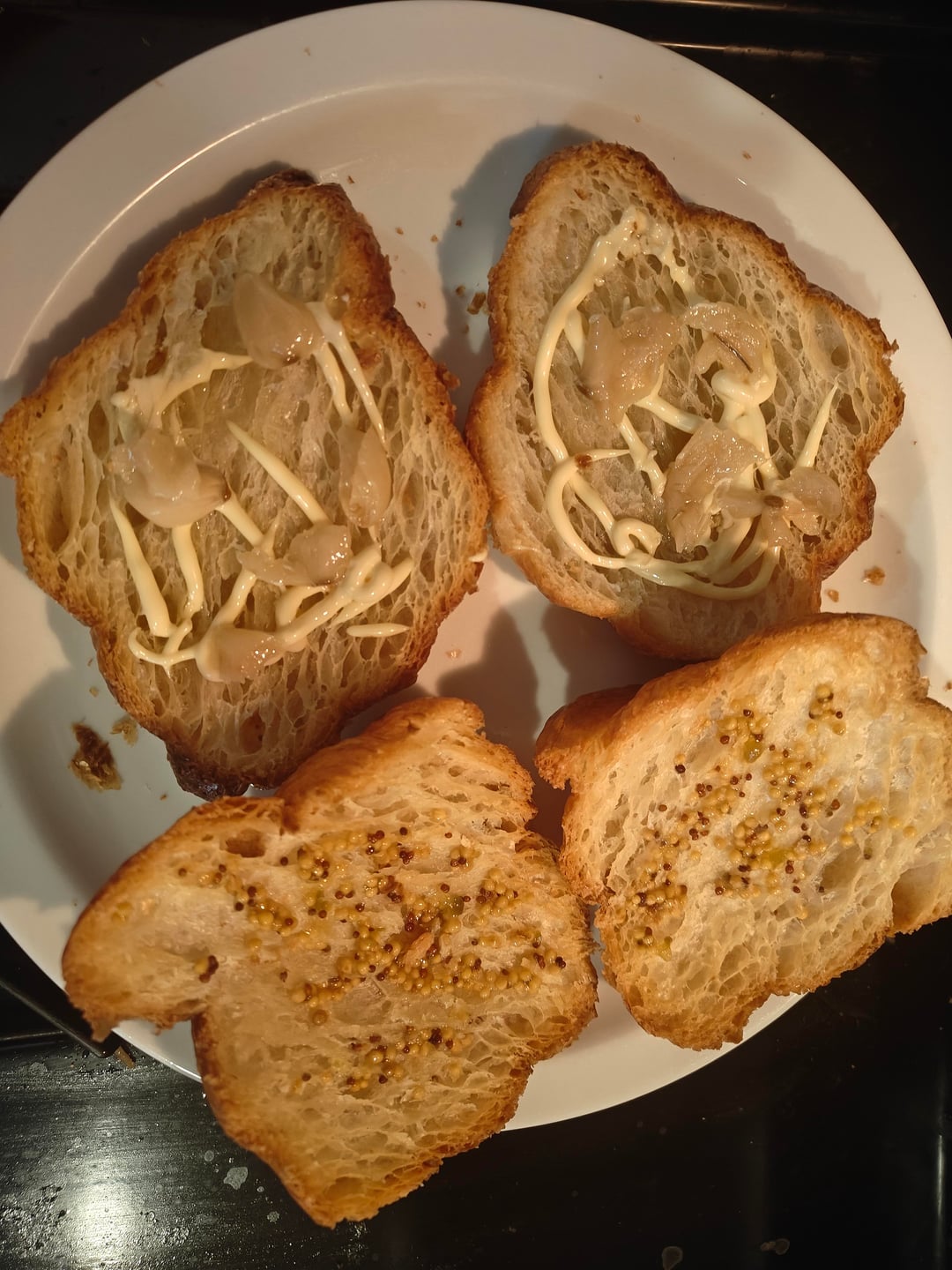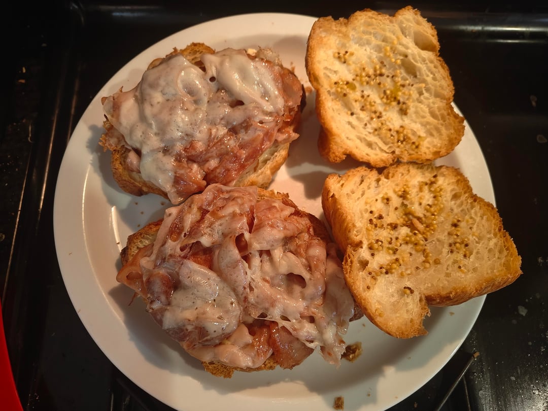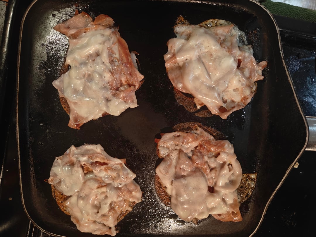 The deli guy did me so right, the mortadella and provolone were both sliced so thin. Each pile on the pan had 2.5 slices of meat and 1.5 slices of cheese and the cheese melted right before my eyes without needing to cover the pan. I was feeling frisky so I threw a lil garlic confit on as well.