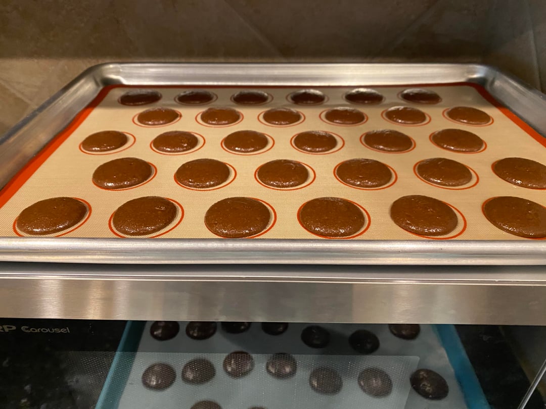 It came out delicious but I noticed some doming and crackly tops, it may be from not properly getting all the air bubbles out since the batter was thick. I let it rest for 1hr 30 minutes before going in the oven at 300° F (I also just bought an oven thermometer) for 16-22 minutes. I also noticed that the tray with a silicon mat had more trouble forming feet than the one with just parchment, next time I will omit the silicon mat.