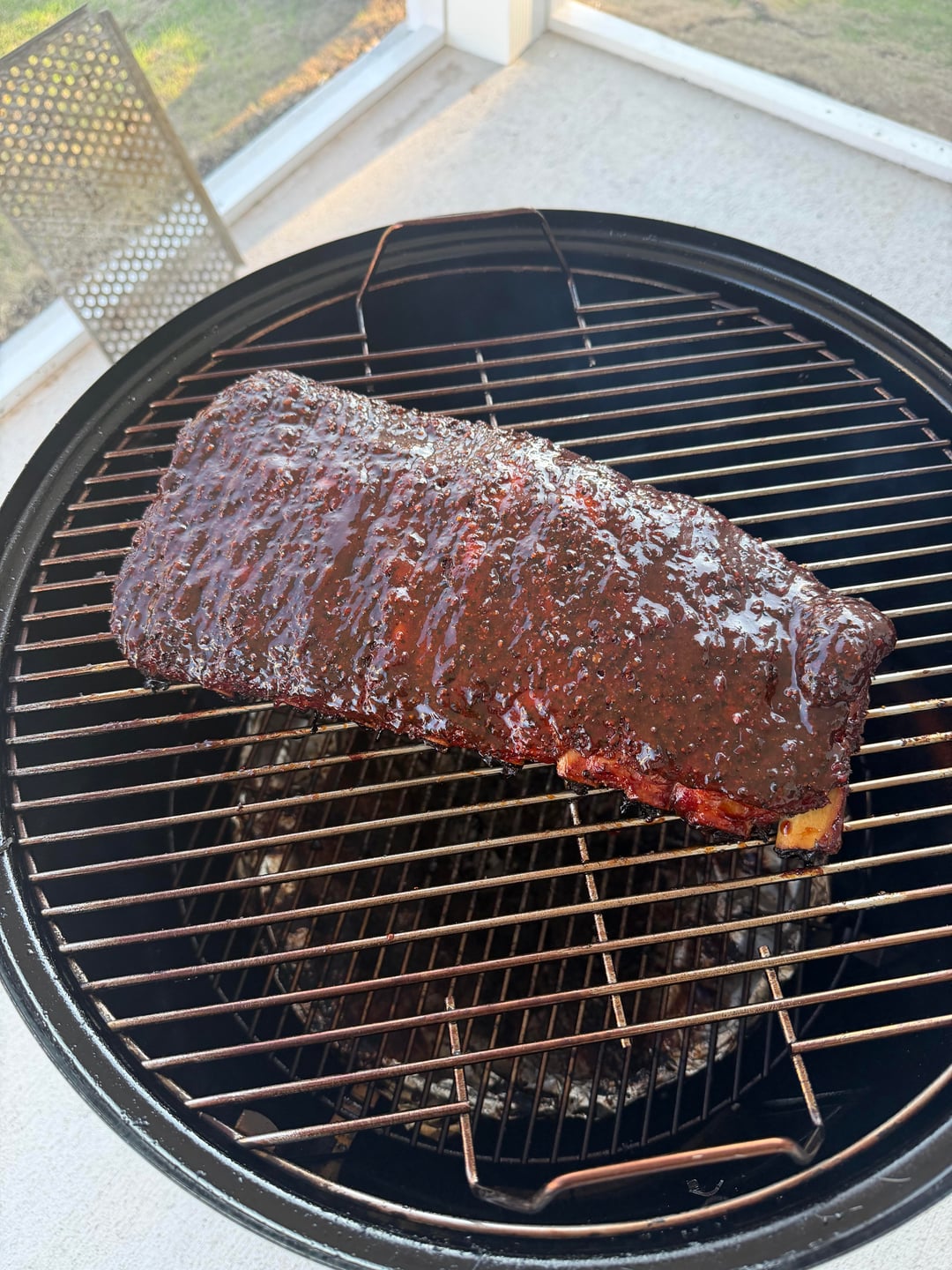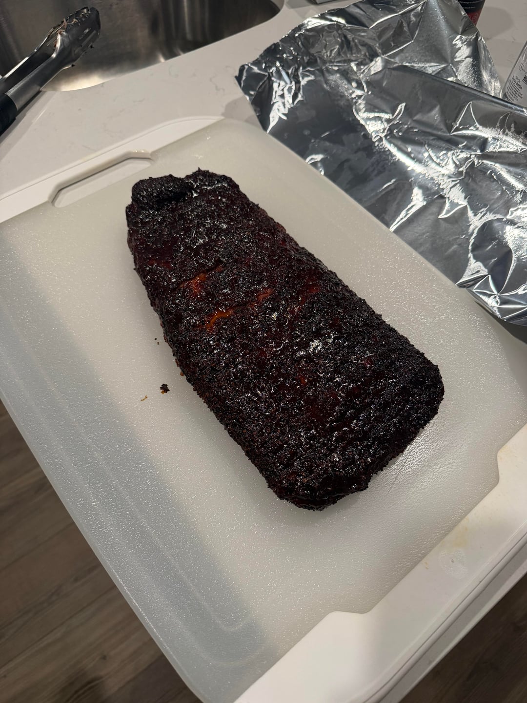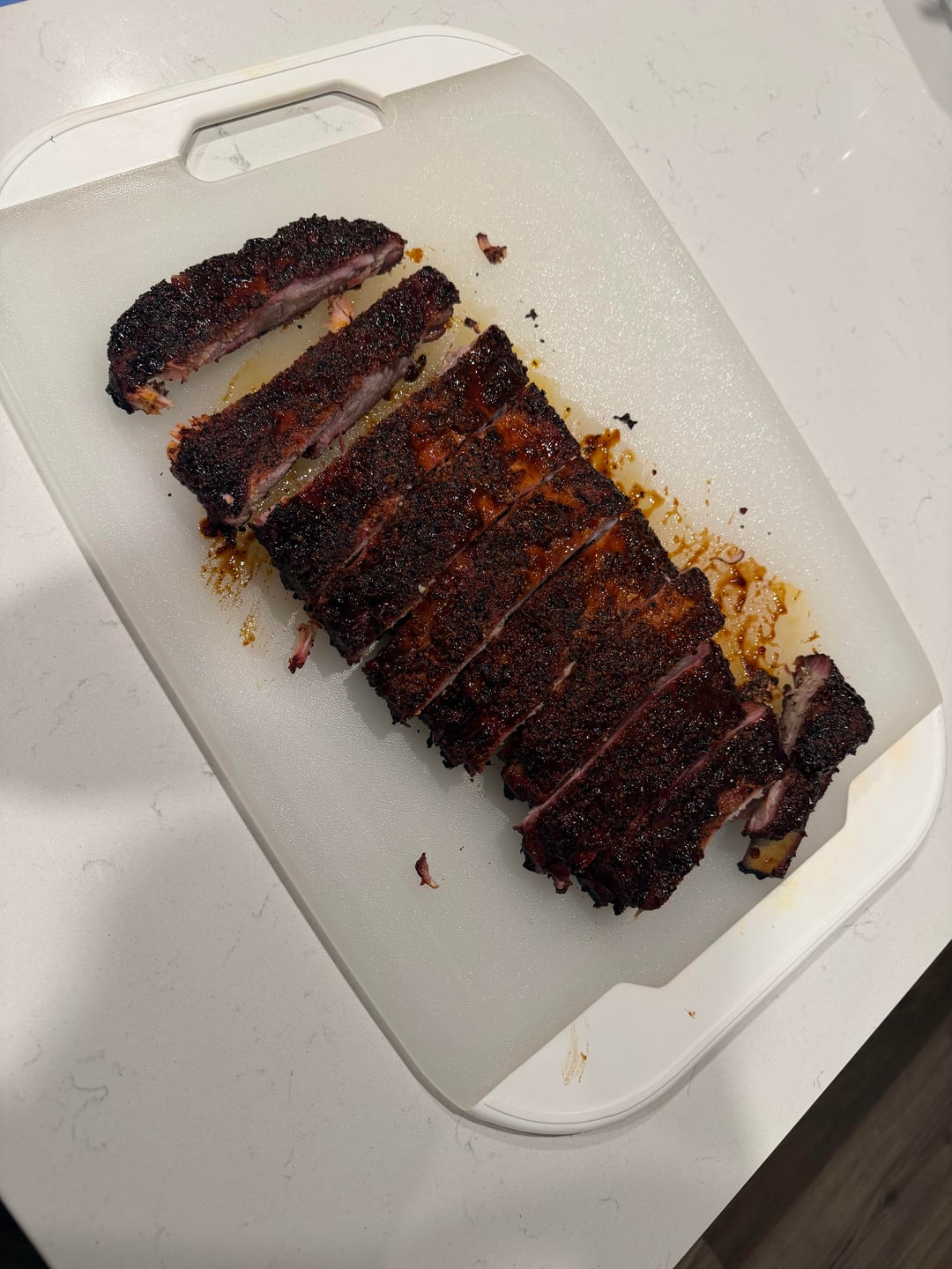 First time smoking ribs! Ran my smoker around 250°F for about 4 hours total. I left them alone for the first hour and a half, then started spritzing with apple cider vinegar about once an hour until they were done. For seasoning I used Meat Church Holy Cow BBQ Rub and Killer Hogs TX Brisket Rub. At the end I basted them with BBQ sauce and let it tack up for about 10 minutes, then pulled them off, wrapped tightly in foil, wrapped in a towel, and rested them in a cooler. Pretty happy with how they turned out — definitely learned a lot and looking forward to getting even better from here.
