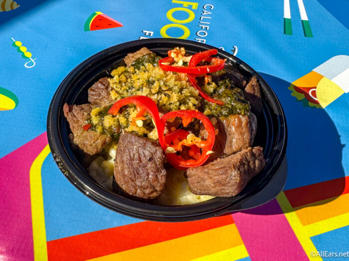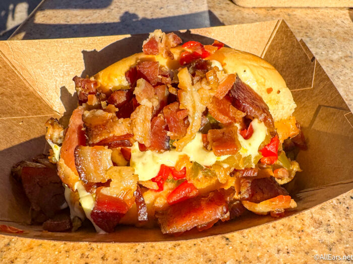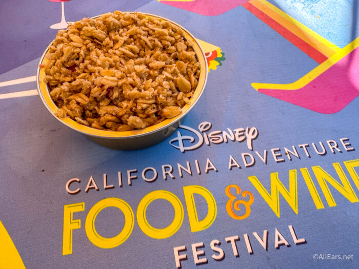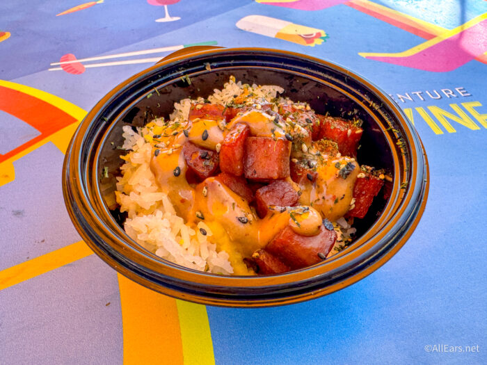 First, we had the Musubi Fried Rice brought to you by Disney Vacation Club. It was inspired by Disney’s AULANI Resort in Hawai’i. It costs $8.75 and features steamed rice with egg, glazed spiced ham, umami mayo, and furikake. This was one of our favorites from last year, and we’re so glad it’s back. It was super savory and salty, and the portion felt more like a whole lunch versus just a quick snack.