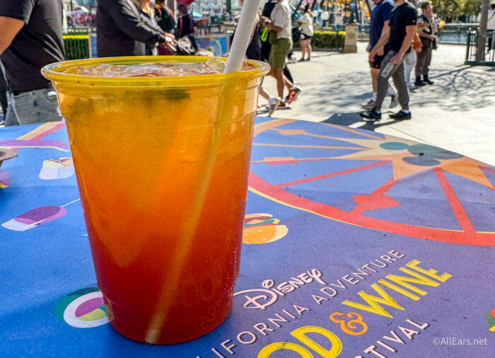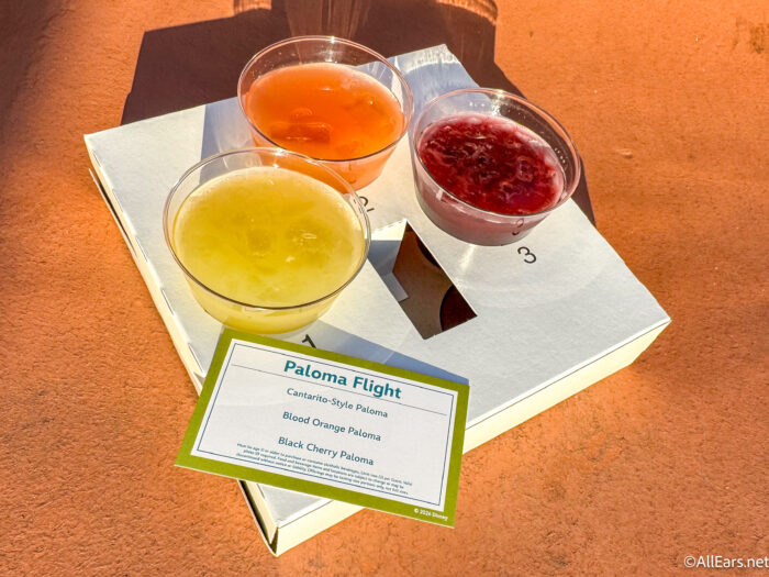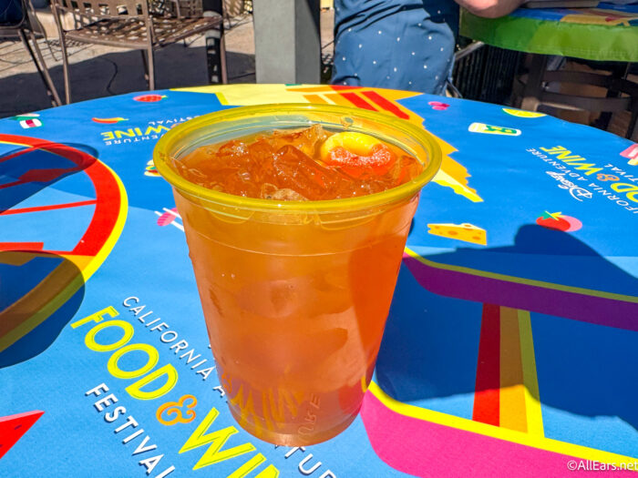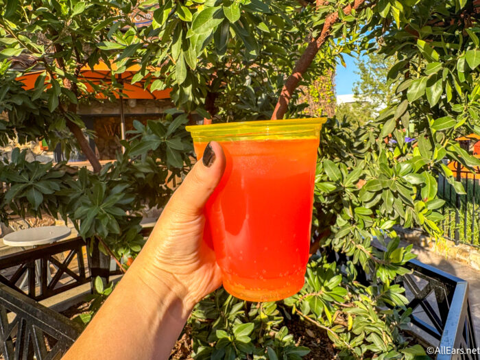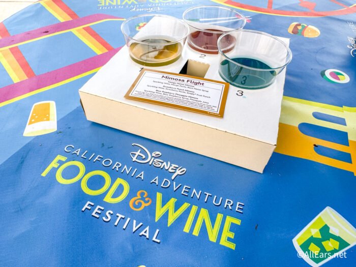 The flight also has the Strawberry Punch Mimosa made with sparkling wine, strawberry purée, and Simply Fruit Punch. This was our favorite of the three in the flight. The flavor is that of sweet, fresh strawberries. It’s a perfectly refreshing drink for a warm day in EPCOT.