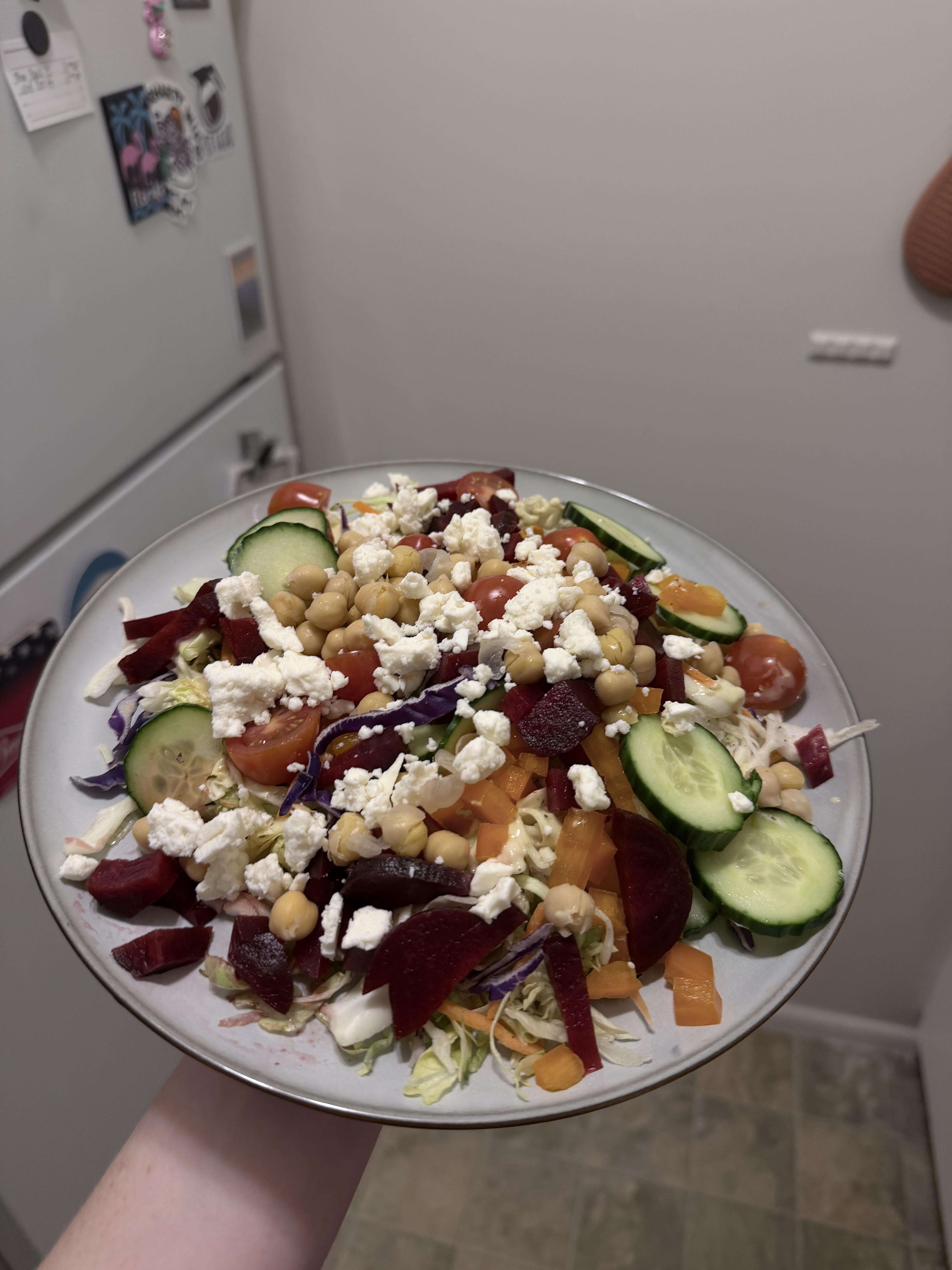 Red/green cabbage, some shredded iceberg (for volume), chickpeas, tomato, cucumber, carrot, beets, orange bell pepper, a serving of feta. Dressed (under veggies) with a lemon juice, hummus, Greek yogurt, Mediterranean seasoning mixture!!! 😀