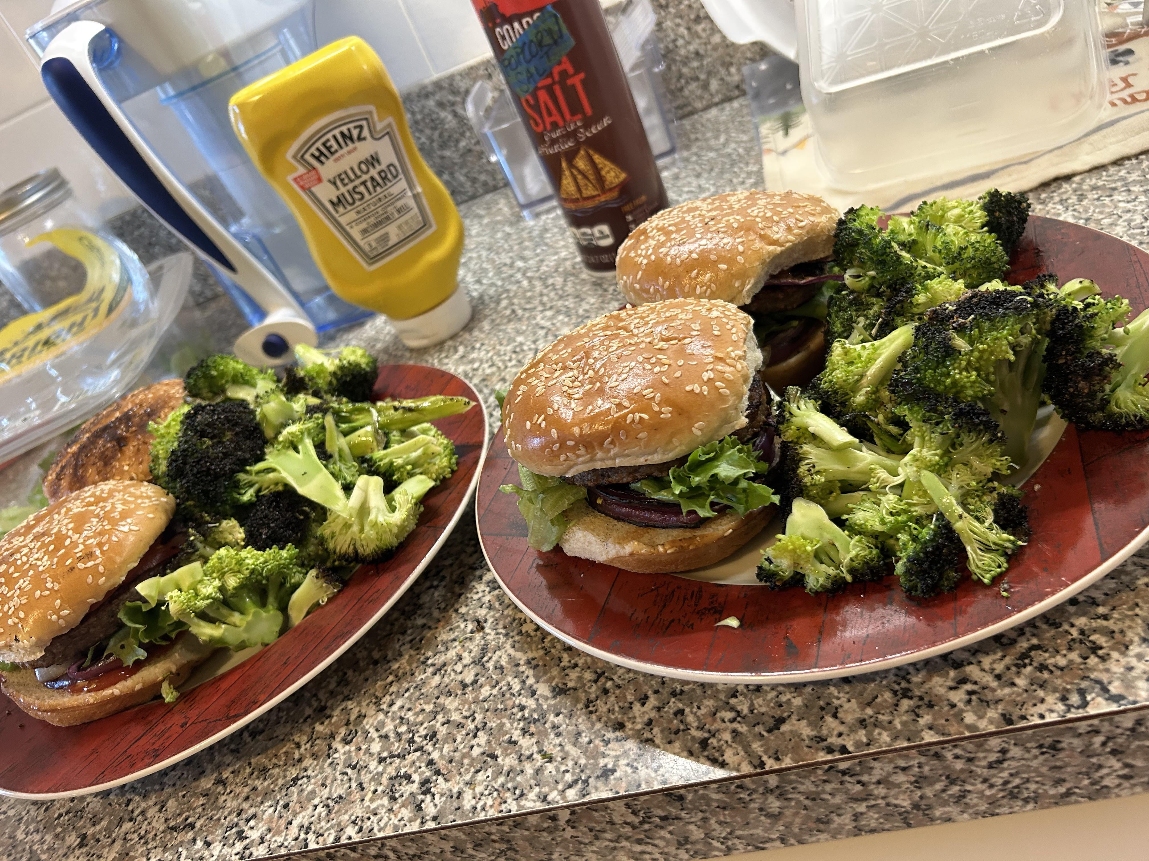 Fired up the grill today. This is wifeys favorite meal, charred to shit broccoli and beyond burgs