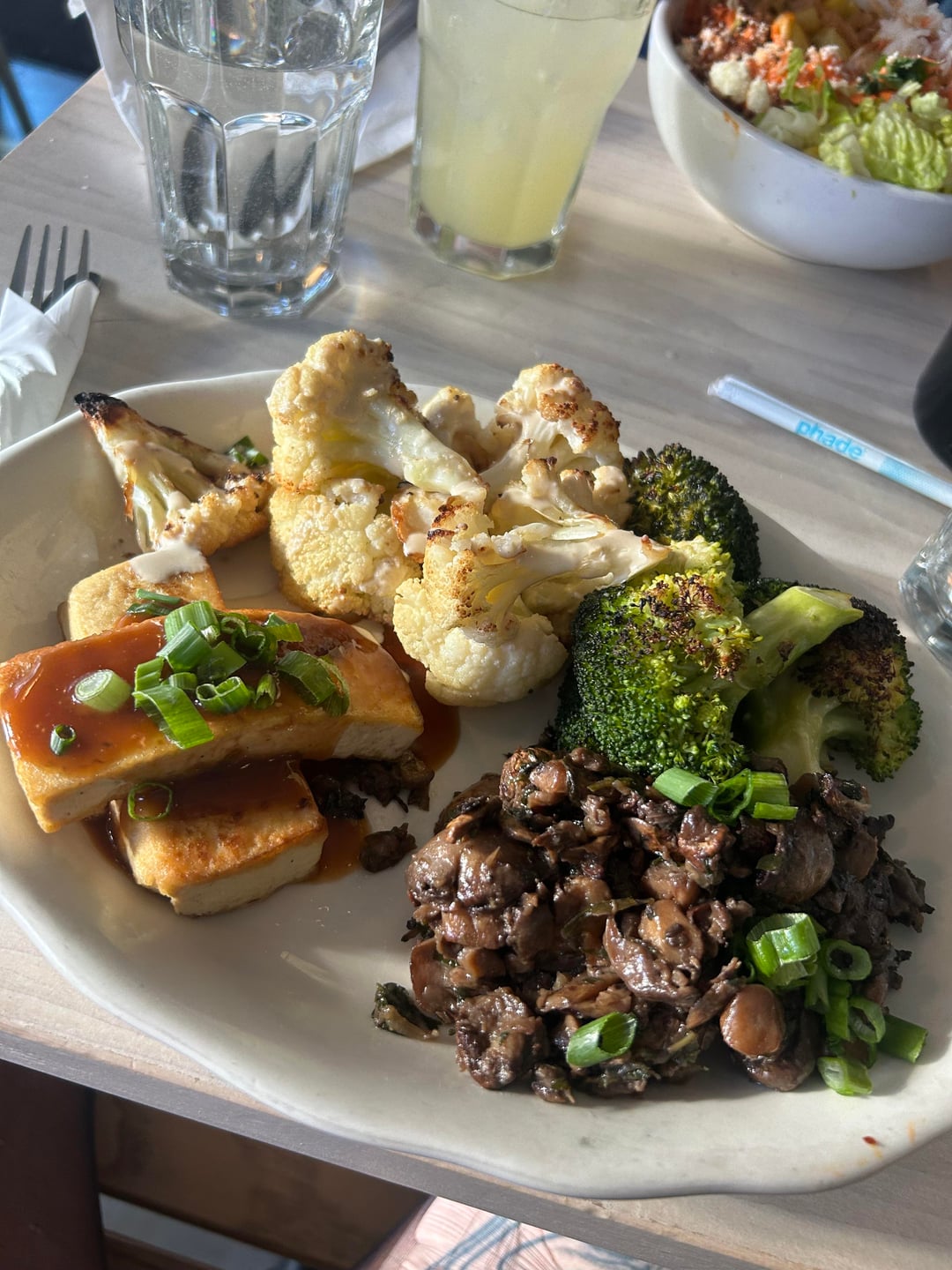 (Roasted broccoli with garlic, roasted cauliflower with tahini, roasted mushrooms with herbs, sautéed tofu with teriyaki drizzle)
