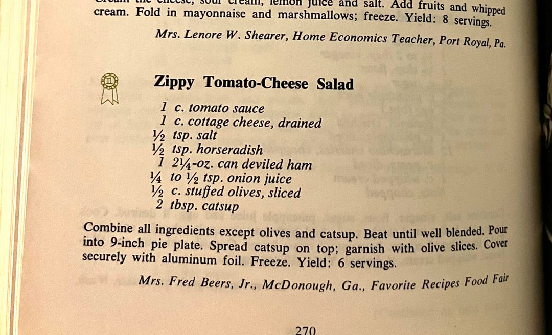 #Zippy Tomato-Cheese Salad 1 c. tomato sauce 1 c. cottage cheese, drained ½ tsp. salt ½ tsp. horseradish 1 2¼-oz. can deviled ham ¼ to ½ tsp. onion juice ½ c. stuffed olives, sliced 2 tbsp. catsup