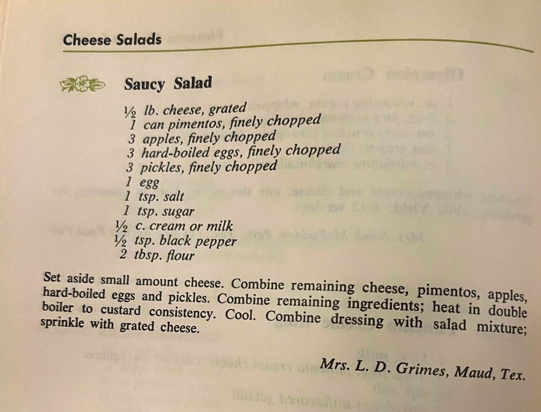 #Saucy Salad ½ lb. cheese, grated 1 can pimentos, finely chopped 3 apples, finely chopped 3 hard-boiled eggs, finely chopped 3 pickles, finely chopped 1 egg 1 tsp. salt 1 tsp. sugar ½ c. cream or milk ½ tsp. black pepper 2 tbsp. flour