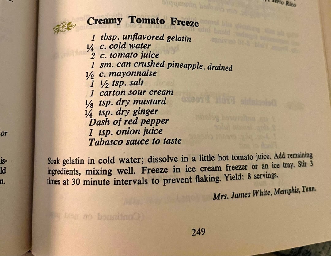 #Creamy Tomato Freeze 1 tbsp. unflavored gelatin ¼ c. cold water 2 c. tomato juice 1 sm. can crushed pineapple, drained ½ c. mayonnaise 1½ tsp. salt 1 carton sour cream ⅛ tsp. dry mustard ¼ tsp. dry ginger Dash of red pepper 1 tsp. onion juice Tabasco sauce to taste