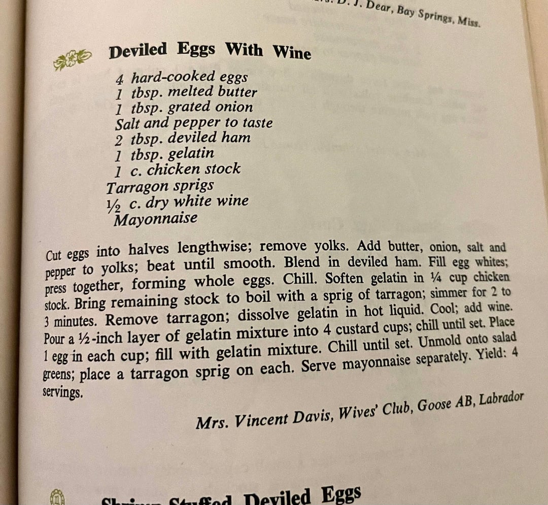 #Deviled Eggs With Wine 4 hard-cooked eggs 1 tbsp. melted butter 1 tbsp. grated onion Salt and pepper to taste 2 tbsp. deviled ham 1 tbsp. gelatin 1 c. chicken stock Tarragon sprigs ½ c. dry white wine Mayonnaise