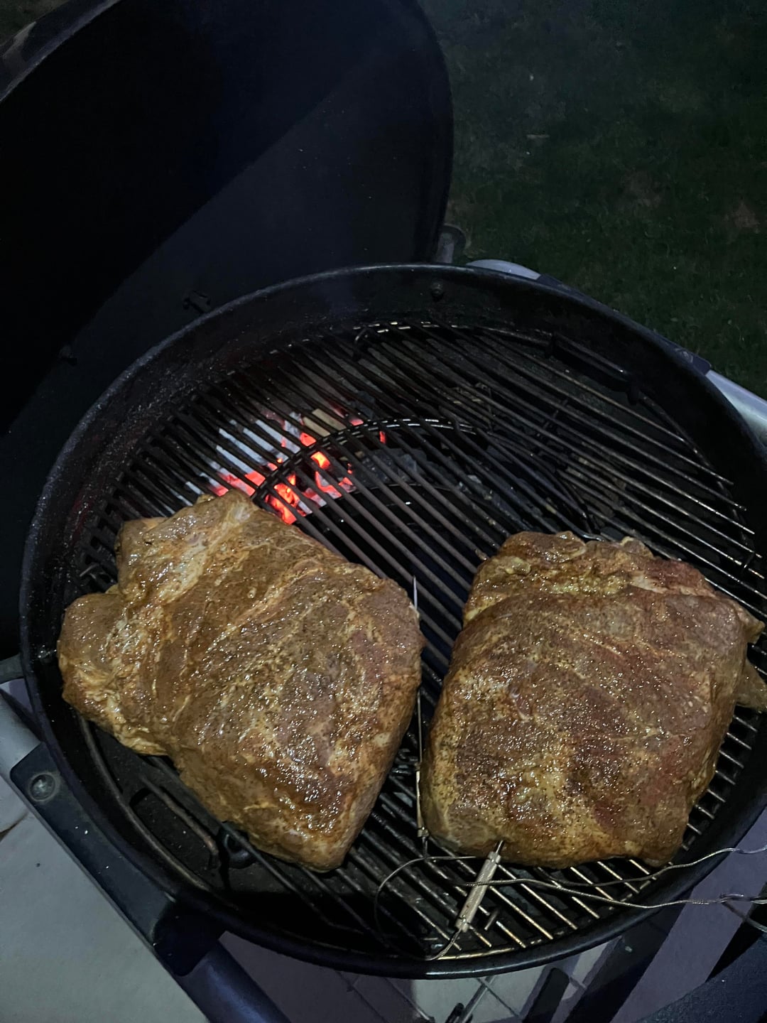 This is my first pork shoulder endeavor, from what I hear it’s pretty forgiving. These are two boneless 6-lb cuts, seasoned with mustard and traeger sweet heat rub (Brian sugar, paprika, garlic). I was pretty diligent about getting even sized coals- FOGO medium lump. It was all I had and I didn’t want to get more so I figured I would try it out and report back. I should’ve taken a picture of the snake but here we are, not opening that baby up. We’re sitting at 220 right now, bottom vents half closed. Let’s hope it stays around there. I’ll make an updated post tonight.