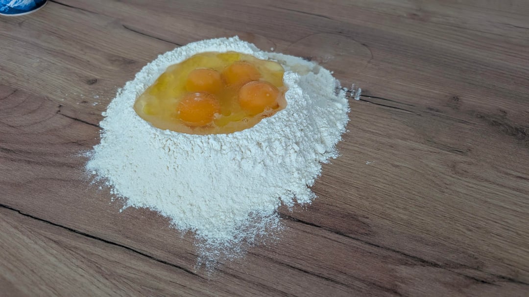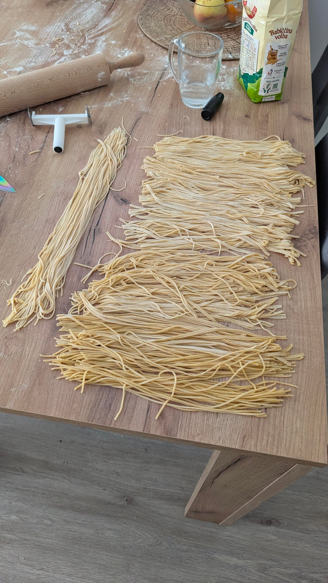 Homemade spaghetti from wheat flower (500g), 4 whole eggs and salt and Portuguese olive oil. (This amount is for 4-5 people)