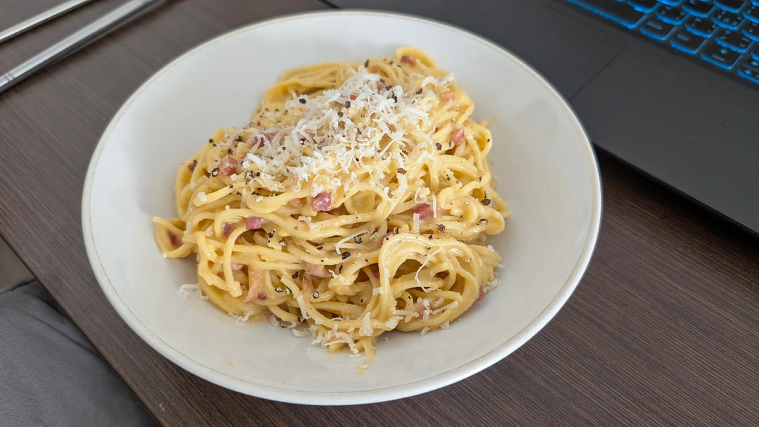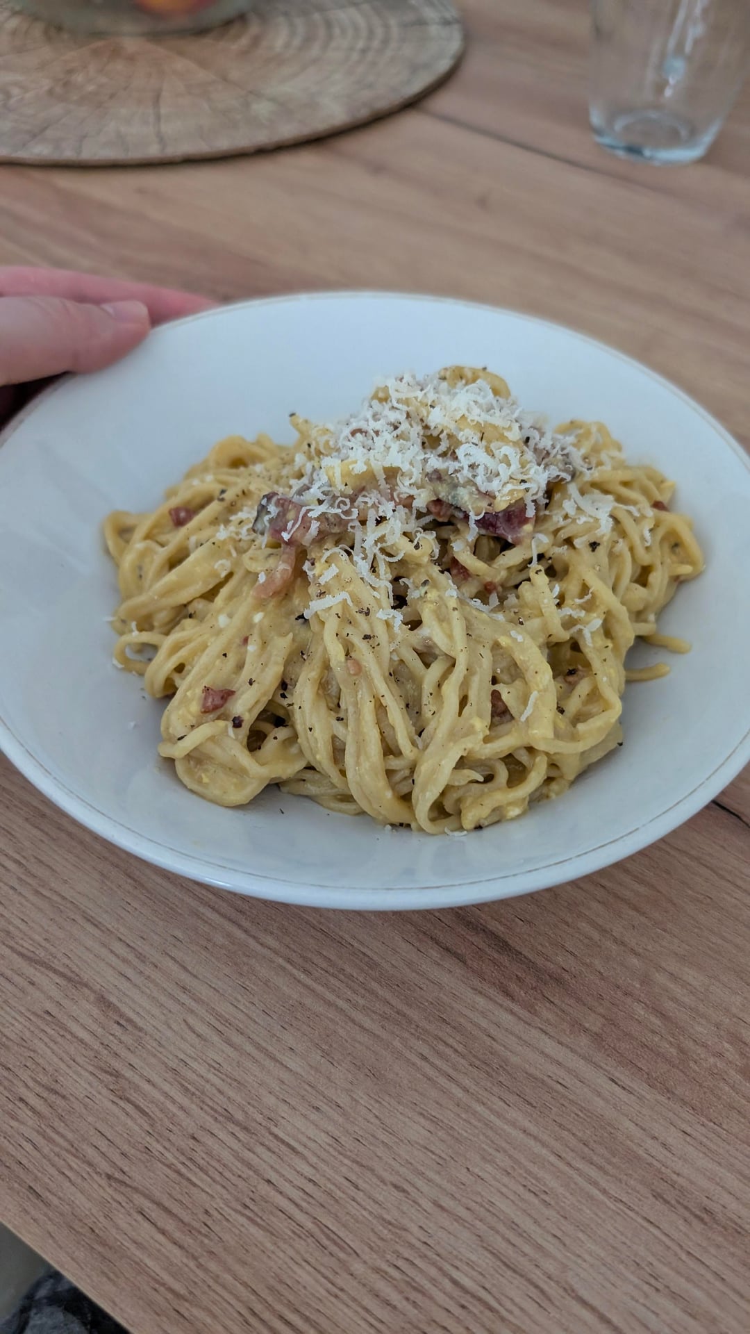 Turn off the heat and add sauce: 4 whole eggs, 2 yolks, ~100g of gran Padano (pecorino is the original), everything mixed together.