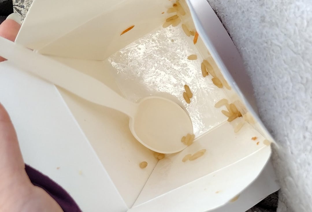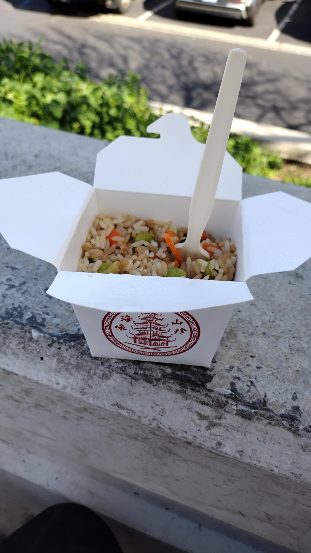 It's in a 16 oz container, but since its not full, It looks like 1.5 cups of fried rice to me. It has carrots, Edamame, soy sauce, oil, and peas. Theres some oil at the bottom, shown in the last picture, but I don't know how much oil was used (I've never made fried rice myself) 😭