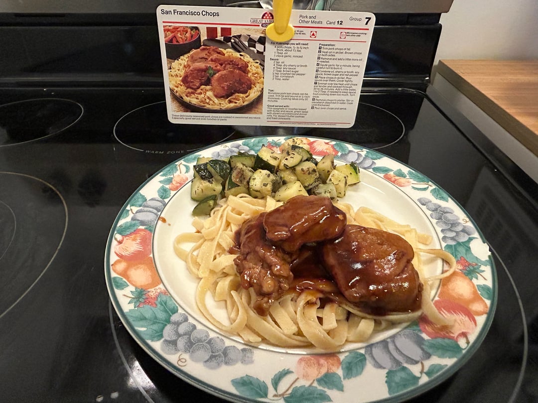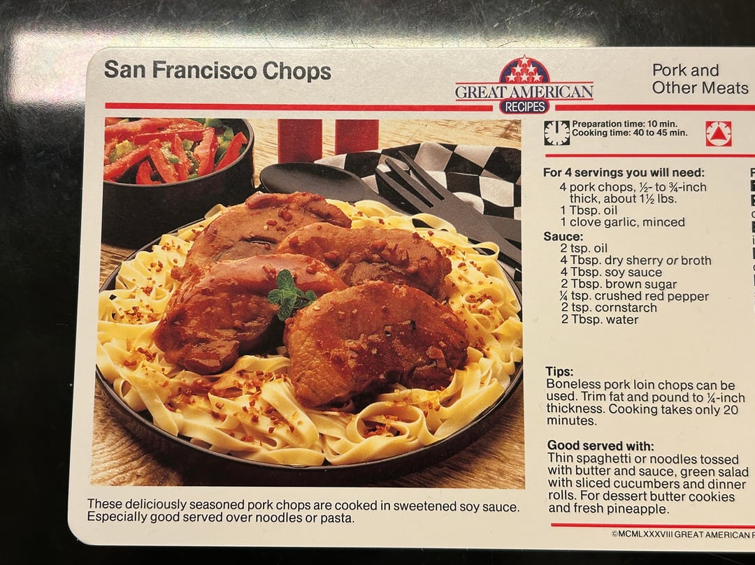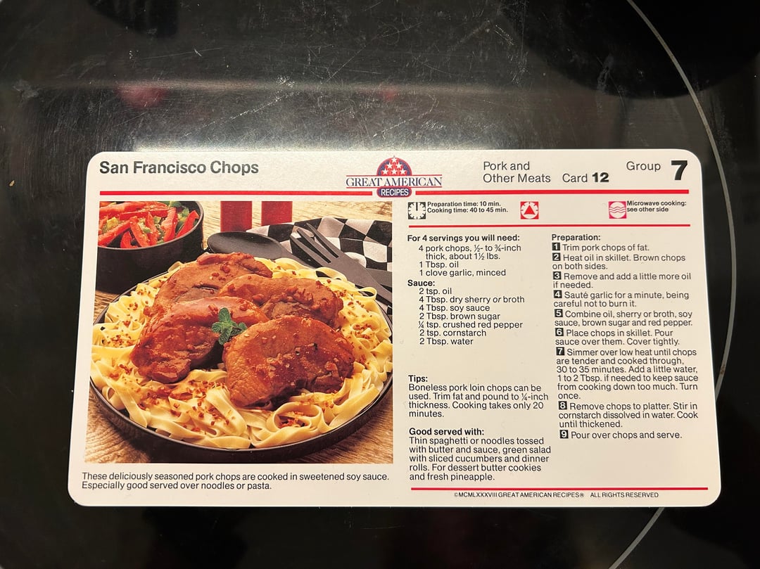 I belonged to that recipe subscription! I still have that exact cards, along with Meatballs in Mustard Sauce, Honeyed Chicken Teryaki, and Boston Baked Beans.