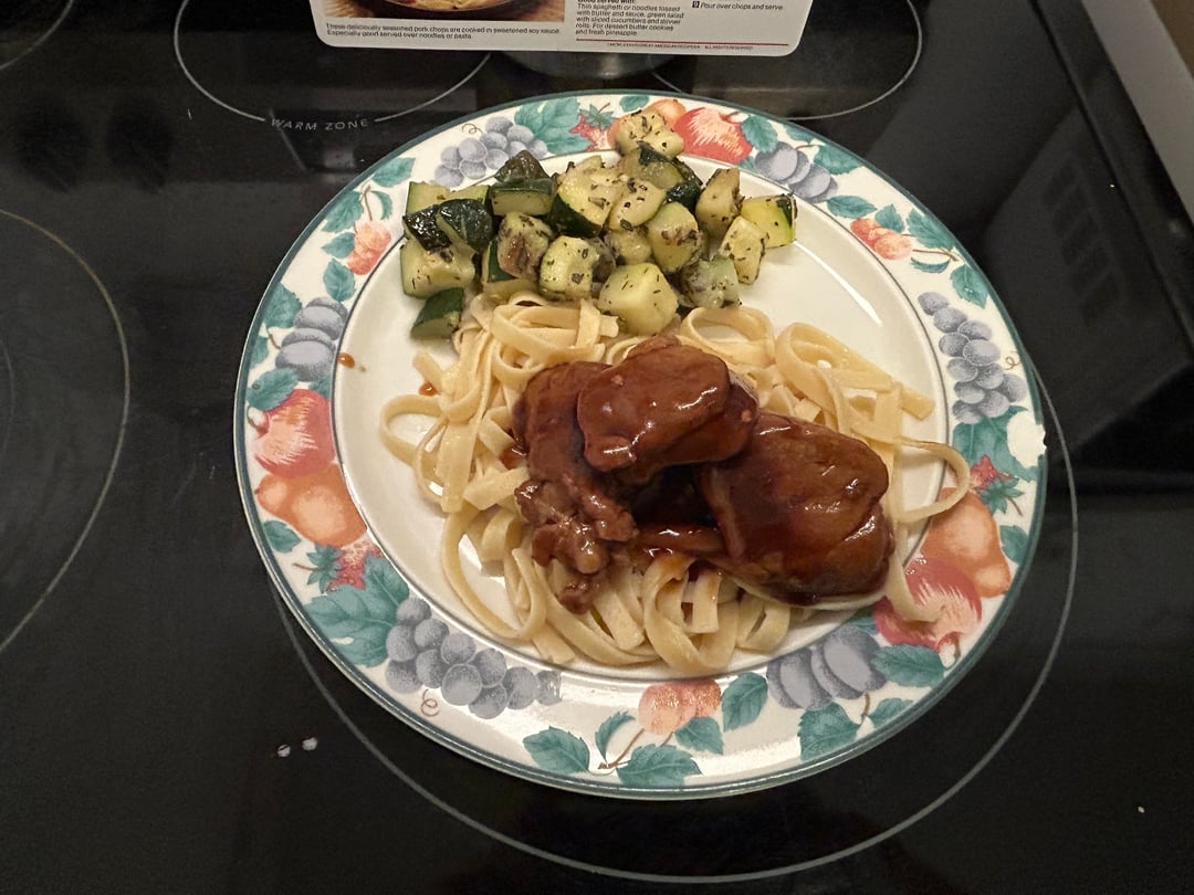 Oh and the vegetable side is sauteed zucchini, and it’s served over buttered fettuccine.