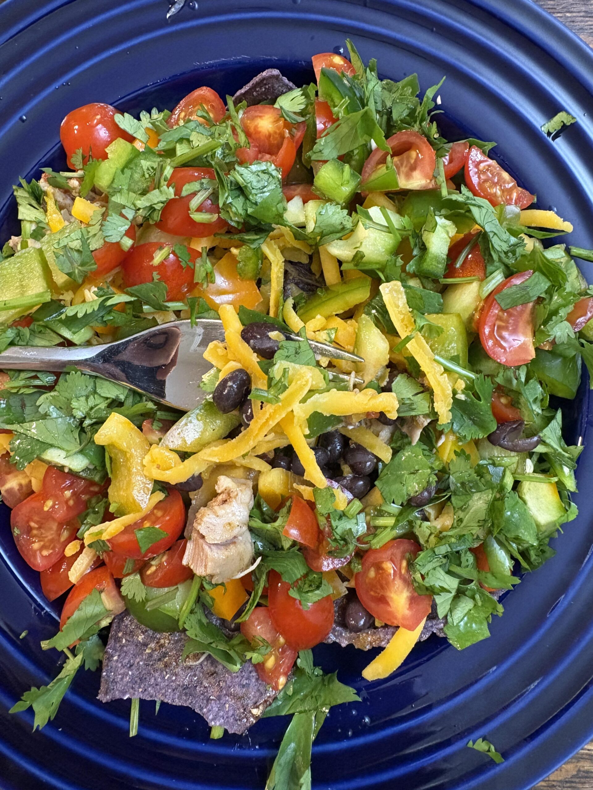 Blue corn tortilla chips can be a whole grain, right? Topped with chicken breast cooked in salsa, black beans, a sprinkle of cheese, tomatoes, bell peppers, jalapeños, chopped spinach, and lime juice. Sometimes I add avocado or scallion.