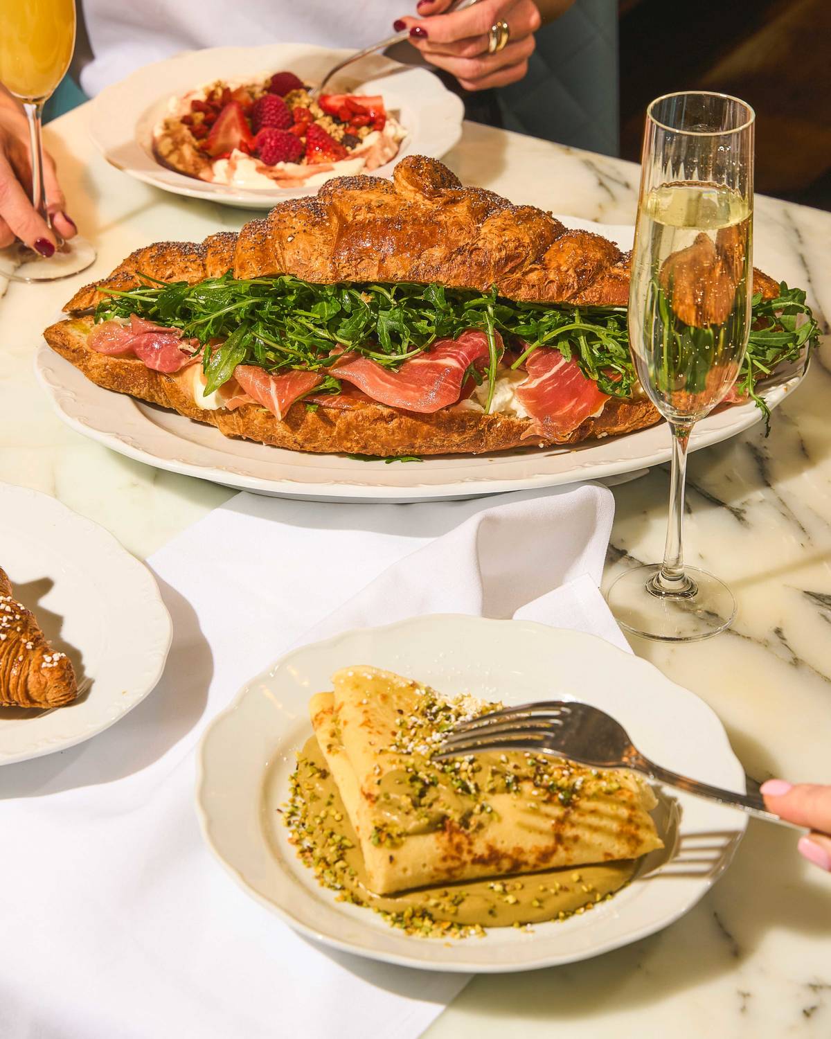 San Carlo Cicchetti, part of the restaurant family founded by Carlo Distefano, has long been a destination for elegant small plates. Now, it’s bringing that same flair to the first meal of the day, with the star of the new menu being their giant croissant. This isn’t your average pastry; it’s a foot-long, flaky creation, baked to a perfect golden-brown and sprinkled with poppy seeds – but the real craft is what’s inside.