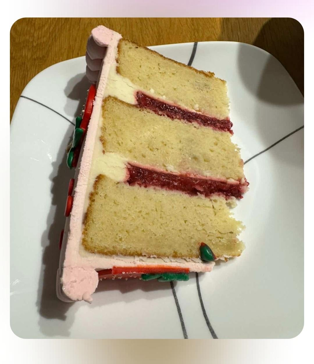 The cookies are shortbread with a mix of strawberry and raspberry jam, and the cake is vanilla with berry filling.