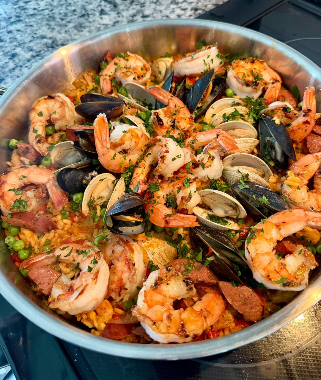 Made the ATK Paella on the Grill recipe. Came out great. Grilling some of the proteins added good flavor. I also used homemade shellfish stock instead of chicken broth. Definitely listened to the recipe comments on the app and put the shellfish in towards the end and not the whole cooking time.