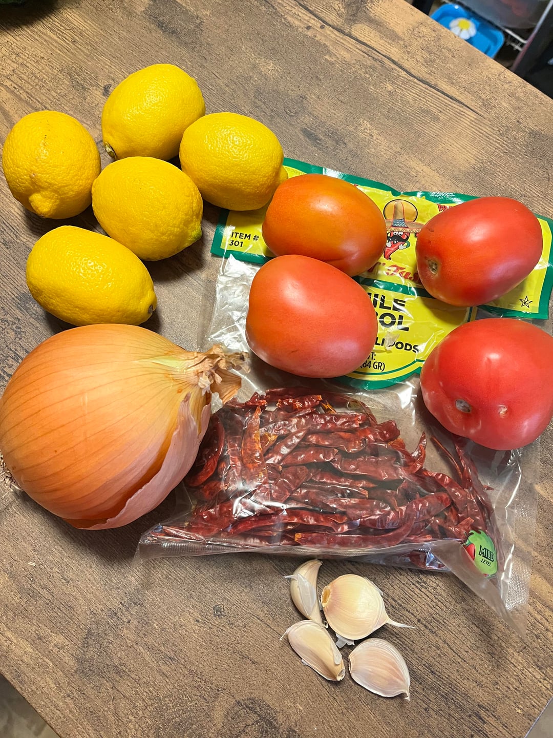 Boil all ingredients in the vinegar and juice of all the lemons. Add the Knorr powder and salt as well( I eyeballed this). Boil time: 40 mins on low