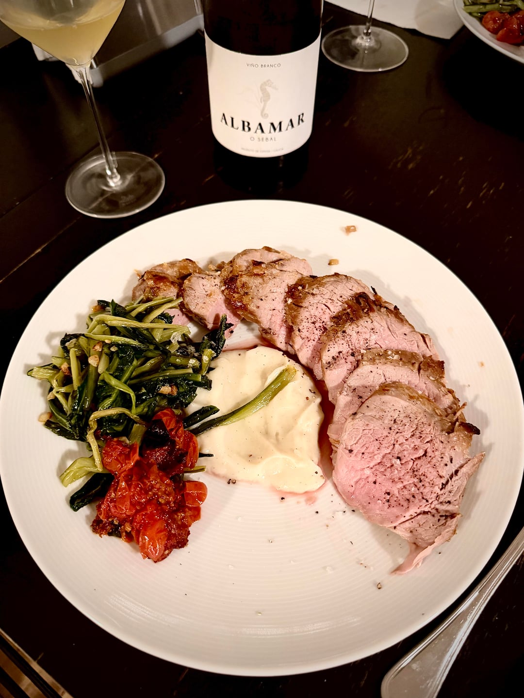 Lovely paired with a roast pork tenderloin (marinated in miso, soy sauce, dijon, garlic, rosemary, lemon and EVOO- chat GPT recipe!), cauliflower puree, roasted cherry tomatoes and sautéed dandelion greens. Yum.