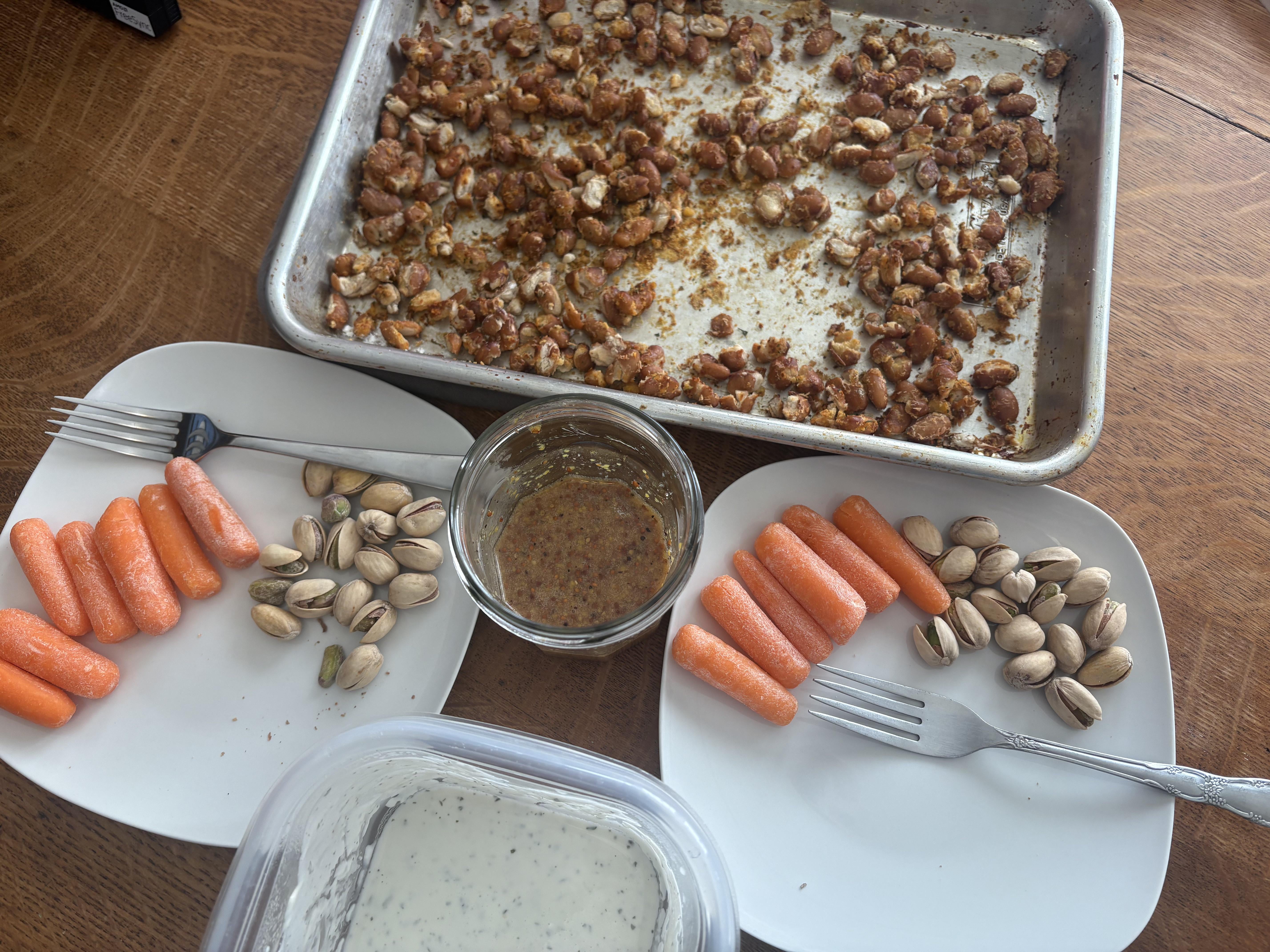 1 can of pinto beans rinsed and dried. Coat in 2 tsp corn starch, 1/2-1 tbs olive oil, 1 tsp pepper, and ranch seasoning to taste. Bake at 400 for 30 minutes tossing half way through. Note: pinto beans are the worst beans i’ve tried this with so far, i recommend a white bean.
