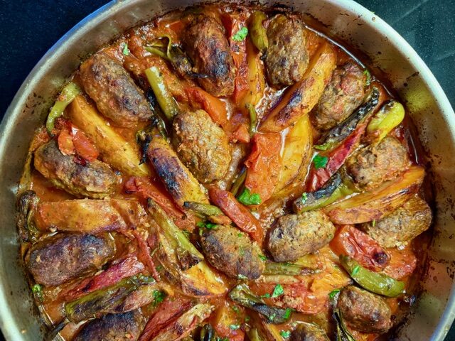 Add the peppers and tomatoes between the potatoes and meatballs in the tray. Gently pour the sauce over the dish and shake the tray slightly so the sauce settles between the ingredients. Return the tray to the oven and bake for another 35–40 minutes. Serve hot with pilaf or chunks of bread on the side. Afiyet olsun.