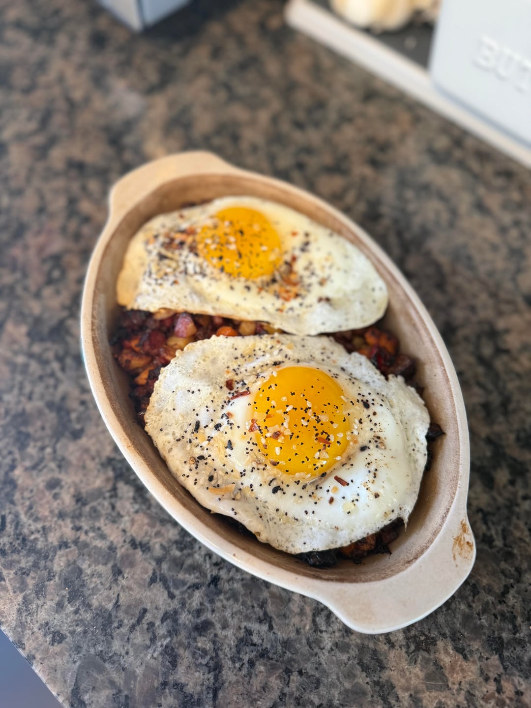 Share Facebook Twitter Pinterest LinkedIn Reddit Corned Beef, red potatoes, sweet potatoes, red bell pepper, Serrano chile, red onion, thyme. Sunny side up eggs with everything bagel seasoning and red chili flakes. by Pasta-Pizza-Tacos 2 Comments Ok_Culture_1914 2 months ago Looks delicious 😋 pecanjazz 2 months ago This is the best corned beef hash I’ve ever seen!