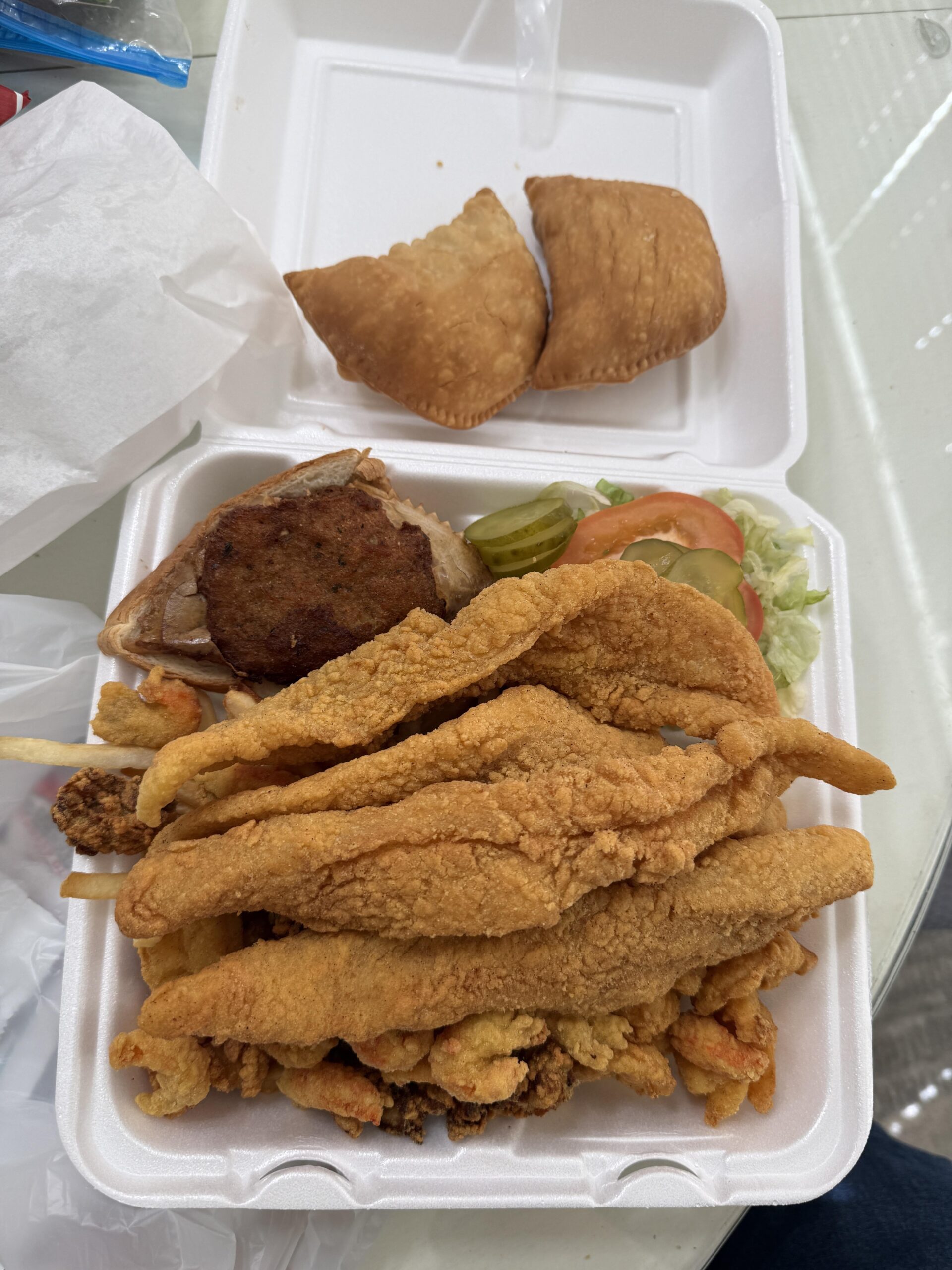 Figured for lunch I shouldn’t go as extravagant as last Friday. So I did a seafood platter from a local joint 10 min away. Fried catfish, stuffed crab, fried shrimp, oyster and crawfish with fries and a salad and two crawfish pies for good measure. All this only set me back 30 bucks