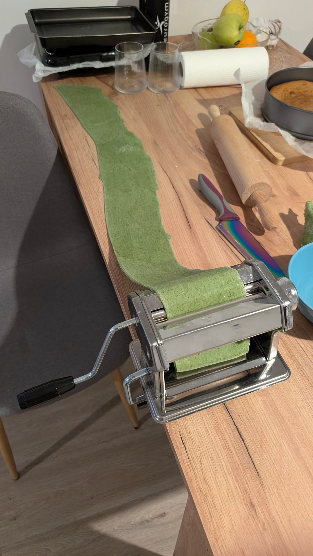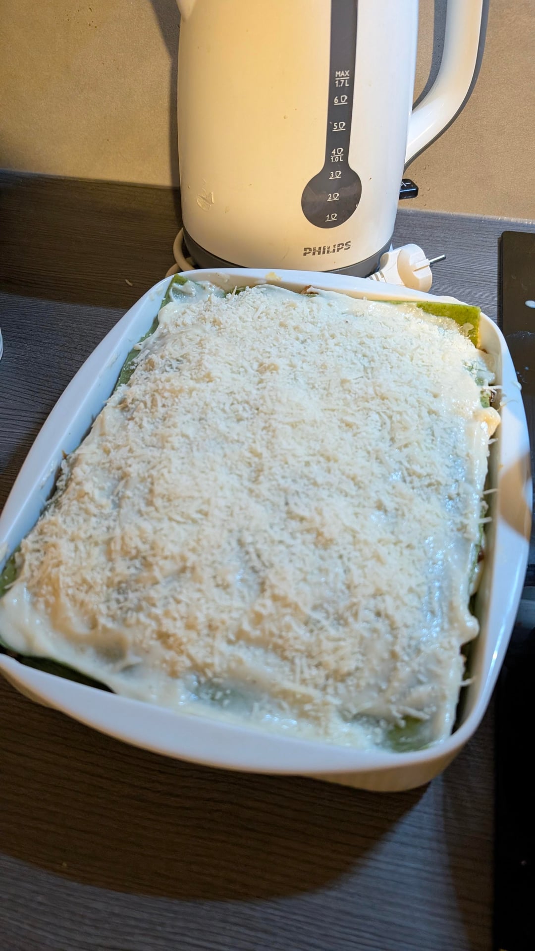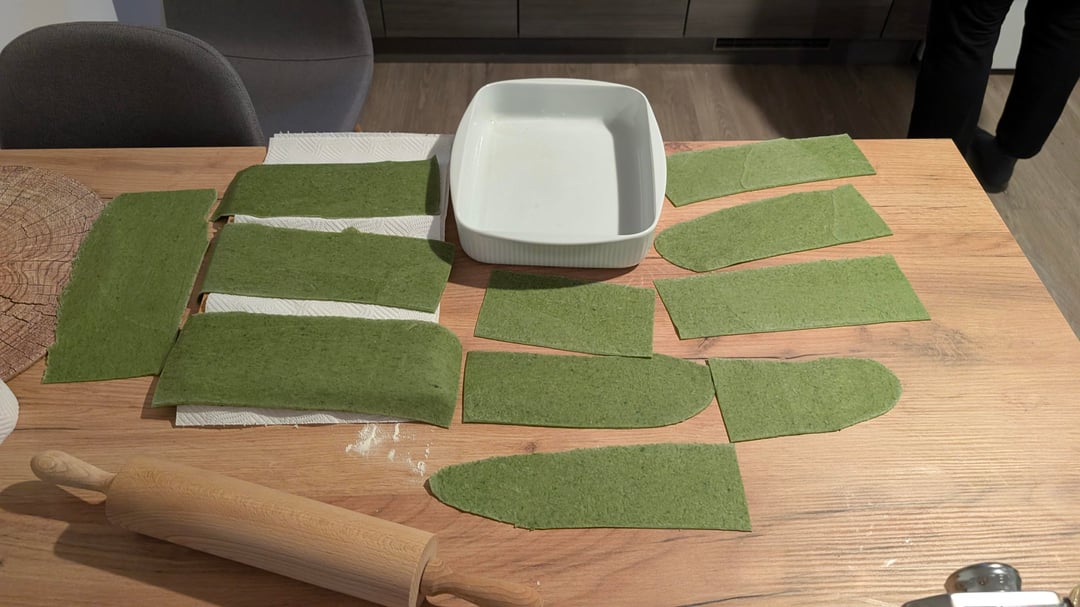 Start by bechamel, then soft meat sauce, then pasta plates (I used fresh spinach pasta).